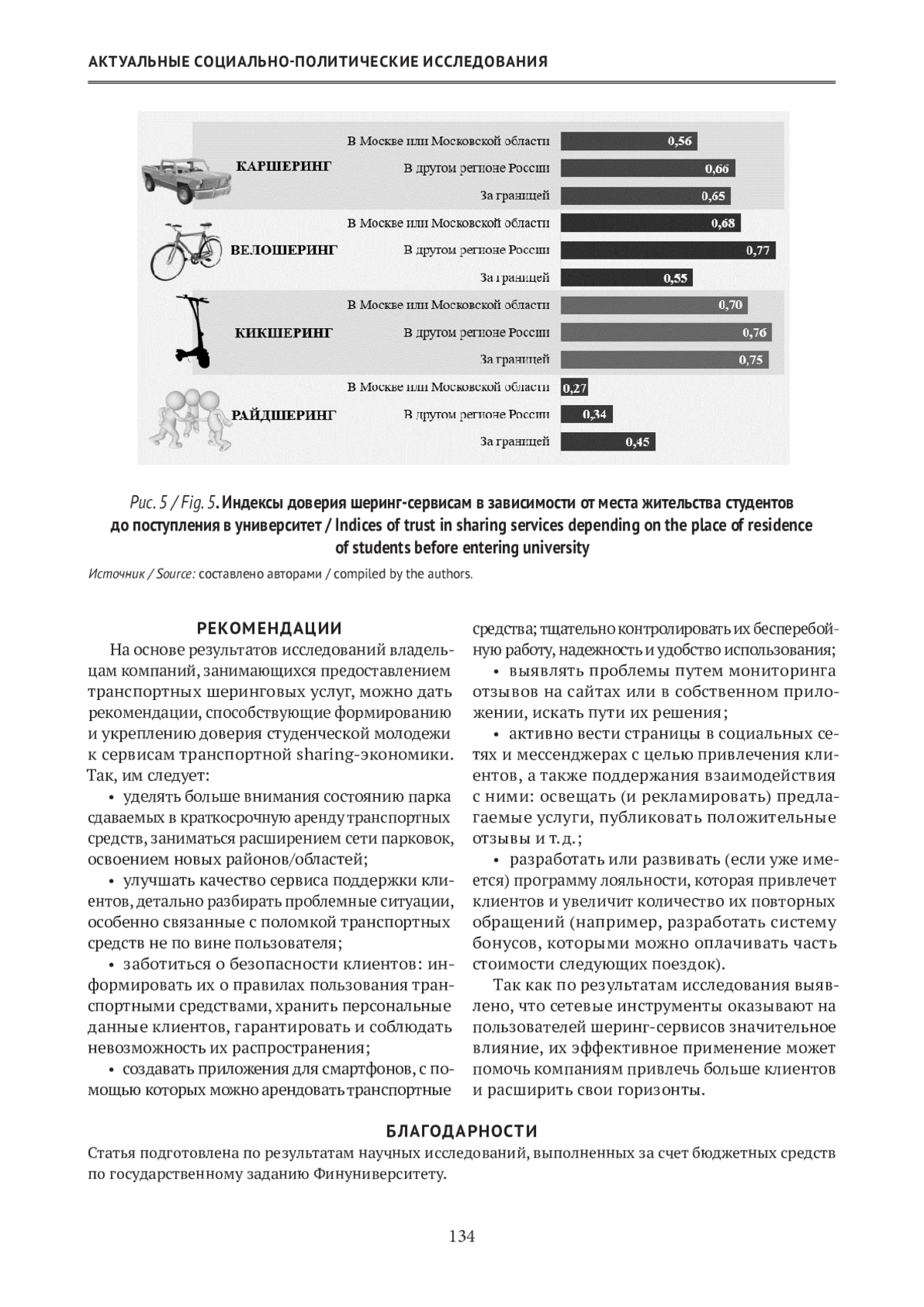 Неожиданный результат получен для райдшеринга: уровень доверия студентов из других стран — гораздо выше, чем у прибывших из субъектов Российской Федерации, и тем более — у жителей Москвы. Предположительно, данный вид сервиса больше развит за границей, сопровождается экономической выгодой и потому вызывает достаточно высокое доверие у иностранных студентов.