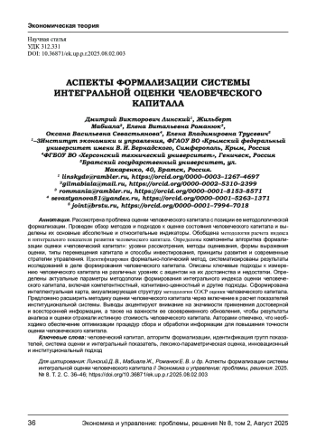 Рассмотрена проблема оценки человеческого капитала с позиции ее методологической формализации. Проведен обзор методов и подходов к оценке состояния человеческого капитала и выделены их основные абсолютные и относительные индикаторы. Обобщена методология расчета индекса и интегрального показателя развития человеческого капитала. Определены компоненты алгоритма формализации оценки «человеческий капитал»: уровни рассмотрения, методы оценивания, формы выражения оценки, типы перемещения капитала и способы инвестирования, принципы развития и современные стратегии управления. Идентифицирован формально-логический метод, систематизированы результаты исследований в деле формирования человеческого капитала. Описаны ключевые подходы к измерению человеческого капитала на различных уровнях с акцентом на их достоинства и недостатки. Определены актуальные параметры методологии формирования интегрального индекса оценки человеческого капитала, включая компетентностный, когнитивно- ценностный и другие подходы. Сформирована интеллектуальная карта, визуализирующая структуру методологии ОЭСР оценки человеческого капитала. Предложено расширить методику оценки человеческого капитала через включение в расчет показателей институциональной системы. Выводы акцентируют внимание на значимости применения достоверной и всесторонней информации, а также на важности ее своевременного обновления, чтобы результаты анализа и оценки отражали истинную стоимость человеческого капитала. Авторами отмечено, что необходимо обеспечение оптимизации процедур сбора и обработки информации для повышения точности оценки человеческого капитала.