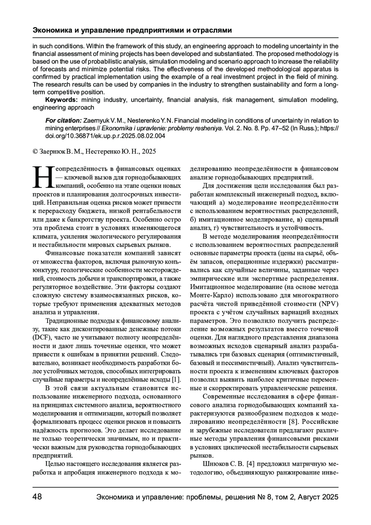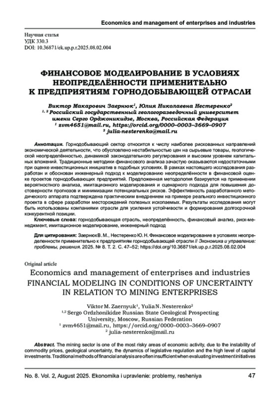 Горнодобывающий сектор относится к числу наиболее рискованных направлений экономической деятельности, что обусловлено нестабильностью цен на сырьевые товары, геологической неопределённостью, динамикой законодательного регулирования и высоким уровнем капитальных вложений. Традиционные методики финансового анализа зачастую оказываются недостаточными при оценке инвестиционных инициатив в подобных условиях. В рамках настоящего исследования разработан и обоснован инженерный подход к моделированию неопределённости в финансовой оценке проектов горнодобывающих предприятий. Предложенная методология базируется на применении вероятностного анализа, имитационного моделирования и сценарного подхода для повышения достоверности прогнозов и минимизации потенциальных рисков. Эффективность разработанного методического аппарата подтверждена практическим внедрением на примере реального инвестиционного проекта в сфере разработки месторождений полезных ископаемых. Результаты исследования могут быть использованы компаниями отрасли для усиления устойчивости и формирования долгосрочной конкурентной позиции.