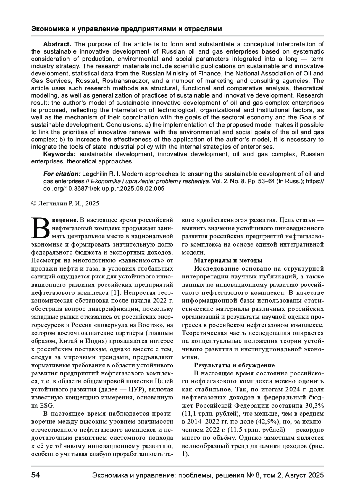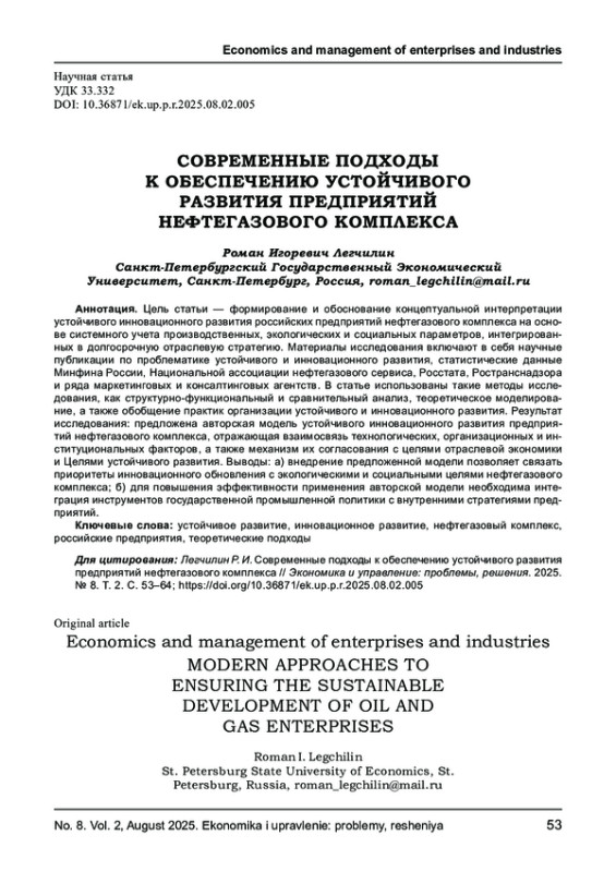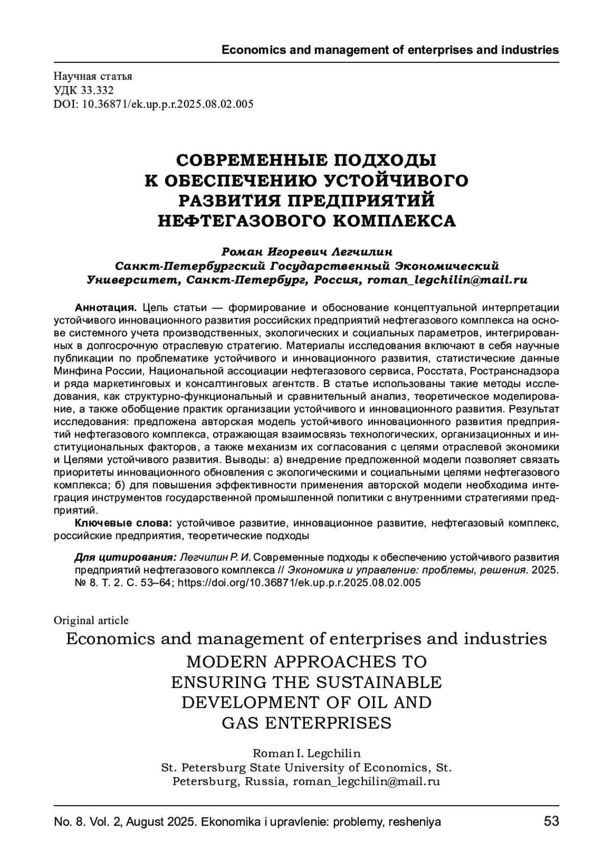 Цель статьи - формирование и обоснование концептуальной интерпретации устойчивого инновационного развития российских предприятий нефтегазового комплекса на основе системного учета производственных, экологических и социальных параметров, интегрированных в долгосрочную отраслевую стратегию. Материалы исследования включают в себя научные публикации по проблематике устойчивого и инновационного развития, статистические данные Минфина России, Национальной ассоциации нефтегазового сервиса, Росстата, Ространснадзора и ряда маркетинговых и консалтинговых агентств. В статье использованы такие методы исследования, как структурно- функциональный и сравнительный анализ, теоретическое моделирование, а также обобщение практик организации устойчивого и инновационного развития. Результат исследования: предложена авторская модель устойчивого инновационного развития предприятий нефтегазового комплекса, отражающая взаимосвязь технологических, организационных и институциональных факторов, а также механизм их согласования с целями отраслевой экономики и Целями устойчивого развития.