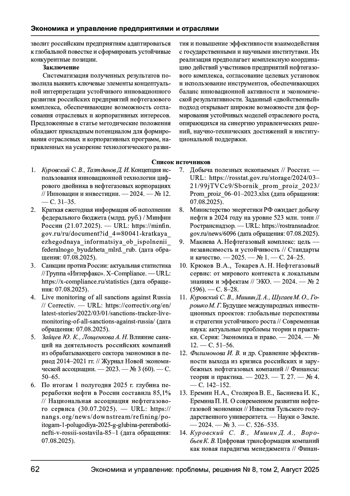 1. Куровский С. В., Тазтдинов Д. И. Концепция использования инновационной технологии цифрового двойника в нефтегазовых корпорациях // Инновации и инвестиции. - 2024. - № 12. - С. 31-35. EDN: GXYNJT