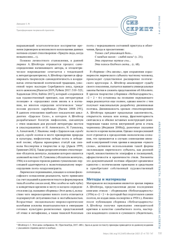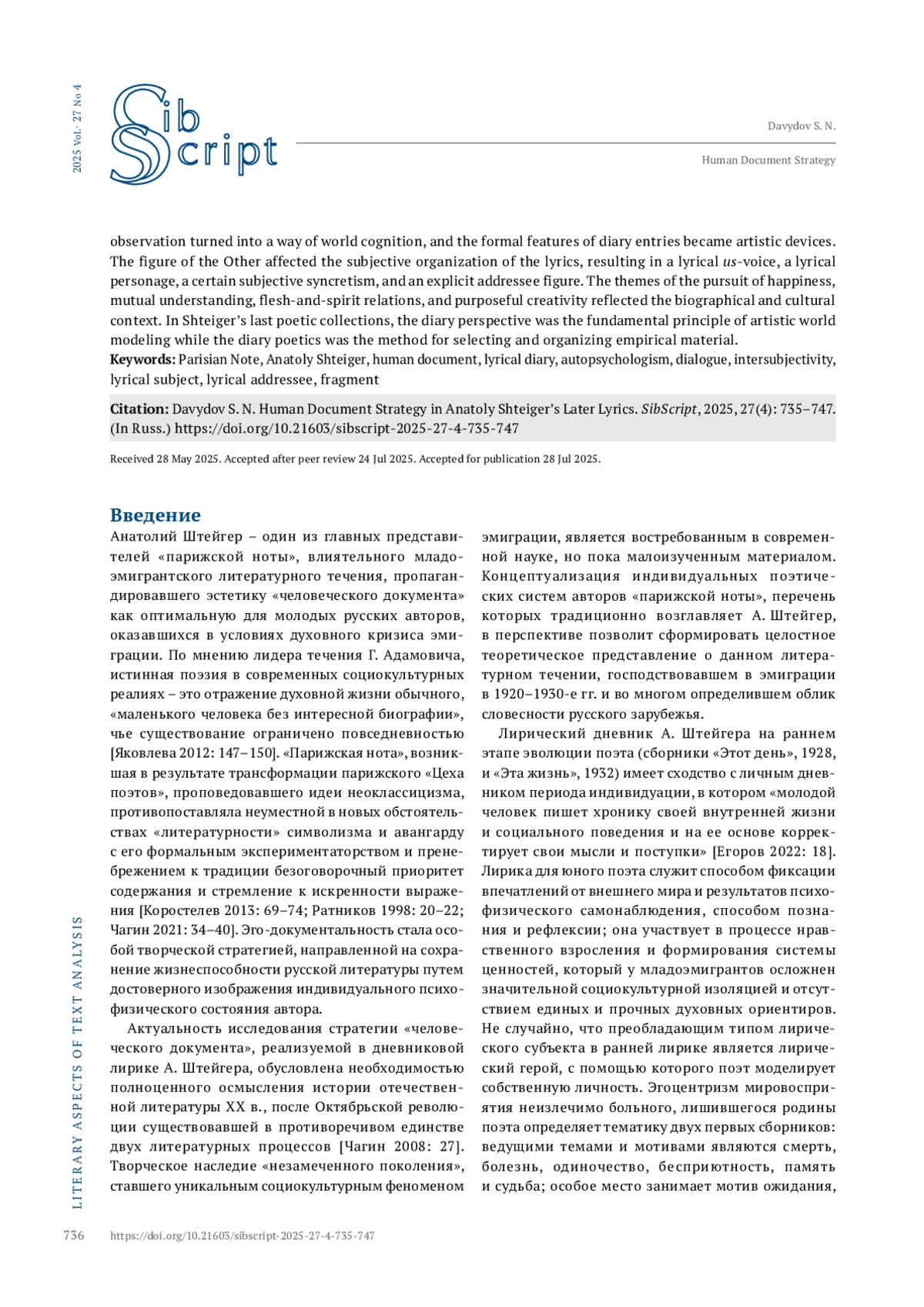 Исследуется реализация дневниковой стратегии творчества в зрелой лирике А. Штейгера (сбор ники «Неблагодарность» и «2 × 2 = 4») как одного из ключевых представителей «парижской ноты» – ведущего младоэмигрантского литературного течения, стремившегося сохранить жизнеспособность русской поэзии в условиях общеевропейского духовного кризиса путем ее интимизации. Доказывается, что в зрелом творчестве поэт преодолевает присущие ему на раннем этапе монологизм сознания и эго- и литературоцентризм мировосприятия и начинает испытывать потребность в диалоге как средстве интеграции в современную социокультурную реальность. Определяется характер эволюции дневникового письма в процессе личностного и творческого становления поэта: дневниковое самонаблюдение превращается в способ познания окружающего мира, а формальные особенности дневниковых записей – в художественные приемы. Утверждается, что значимость для взрослого поэта фигуры Другого оказывает влияние на субъектную организацию лирики; выявляется семантика основных форм присутствия субъекта – лирического мы и ролевого героя; описываются случаи субъектного синкретизма; анализируется роль эксплицитного адресата. Рассматривается проблематика зрелой лирики (возможность счастья и понимания, взаимосвязь материи и духа, предназначение творчества) в соотношении с биографическим и культурным контекстом. Делаются выводы о специфике дневниковости двух последних сборников А. Штейгера: дневниковая оптика является основополагающим принципом художественного миромоделирования, а дневниковая поэтика воплощает особый метод отбора и организации эмпирического материала.