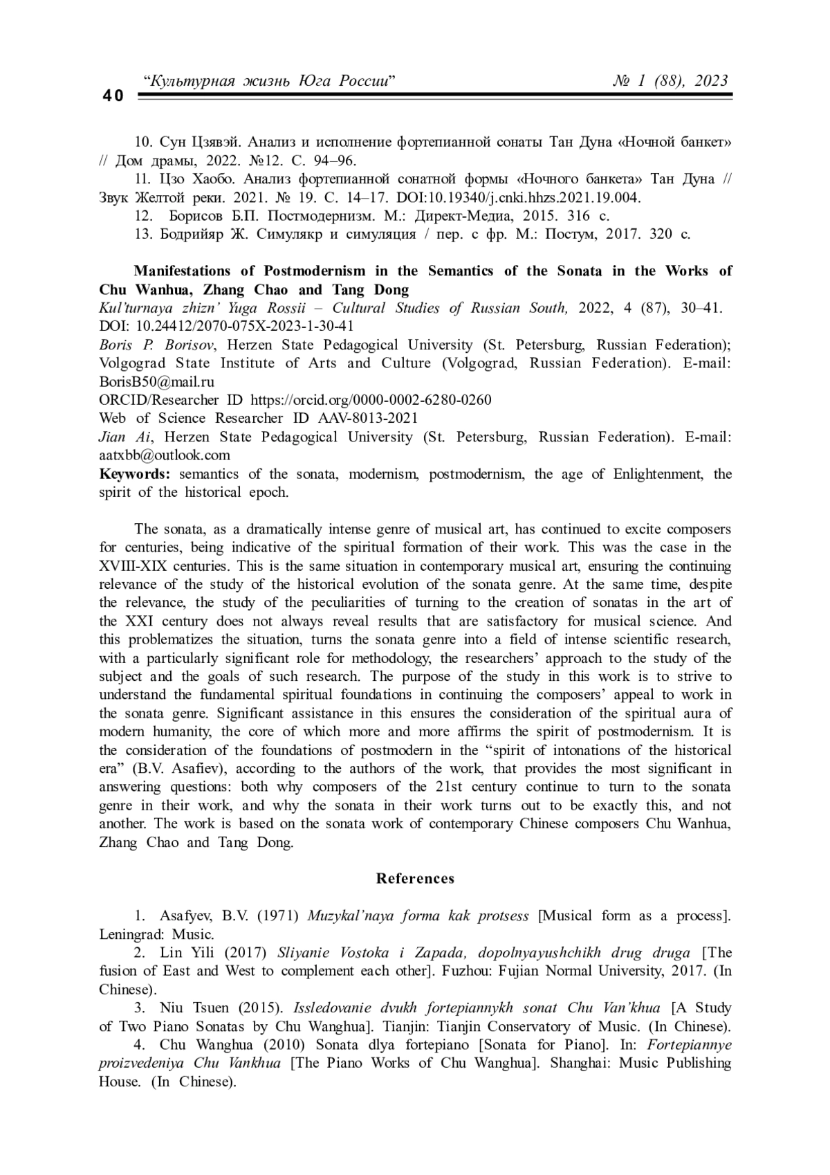 Постмодернизм, как адекватный нашей современности строй массового сознания, вполне характеризует не только области идеологии, политики, но также и сферу искусства, в частности – музыкального. Примером тому может служить сонатное творчество китайских композиторов Чу Ванхуа, Чжан Чао и Тан Дуна, исследование которого осуществляется в настоящей статье.