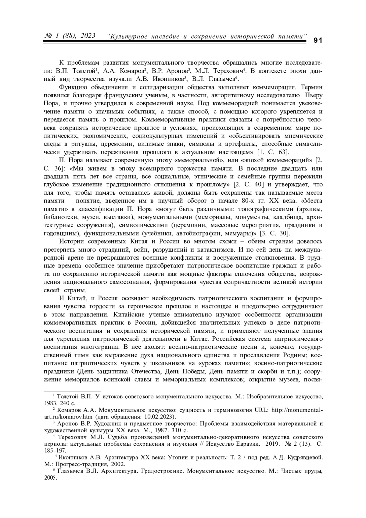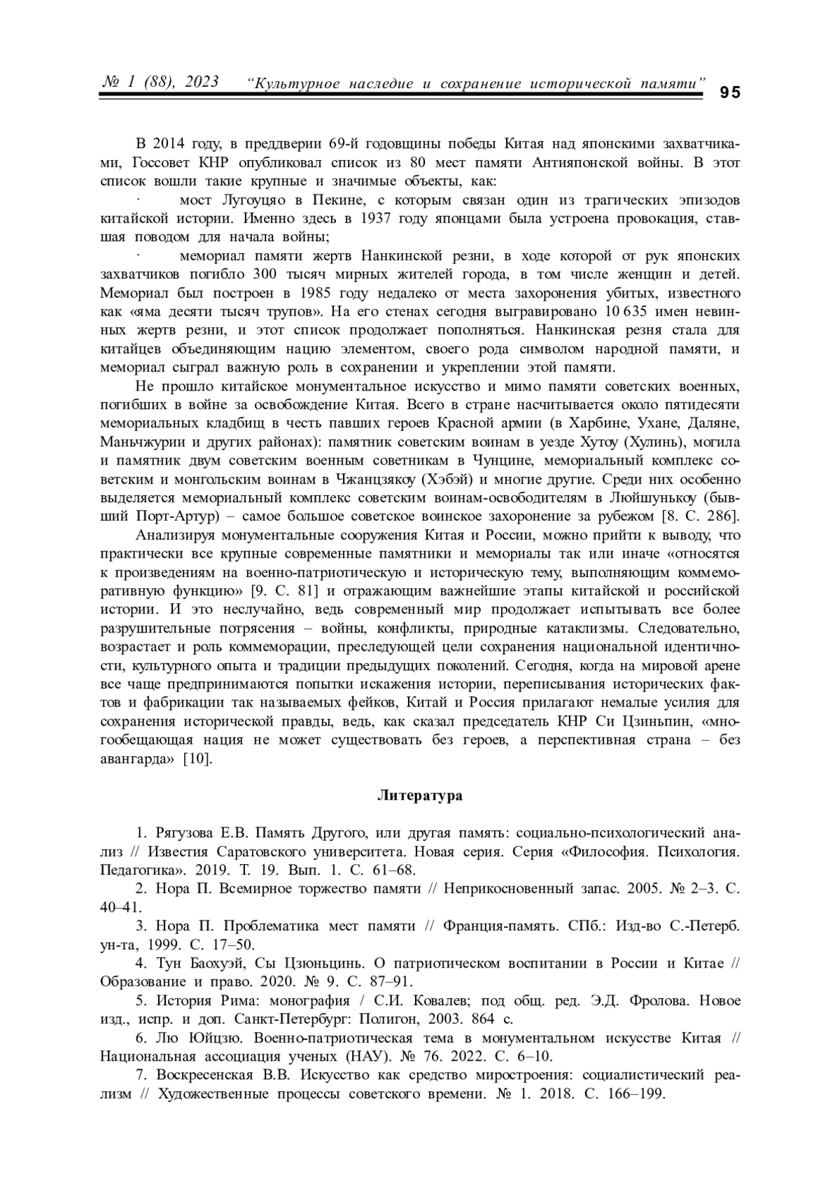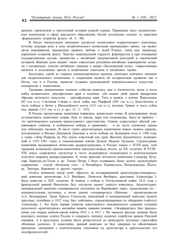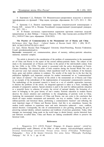 ЛЮ Ю. ПРАКТИКА КОММЕМОРАЦИИ В МОНУМЕНТАЛЬНОМ ИСКУССТВЕ РОССИИ И КИТАЯ // КУЛЬТУРНАЯ ЖИЗНЬ ЮГА РОССИИ. 2023. № 1 (88)