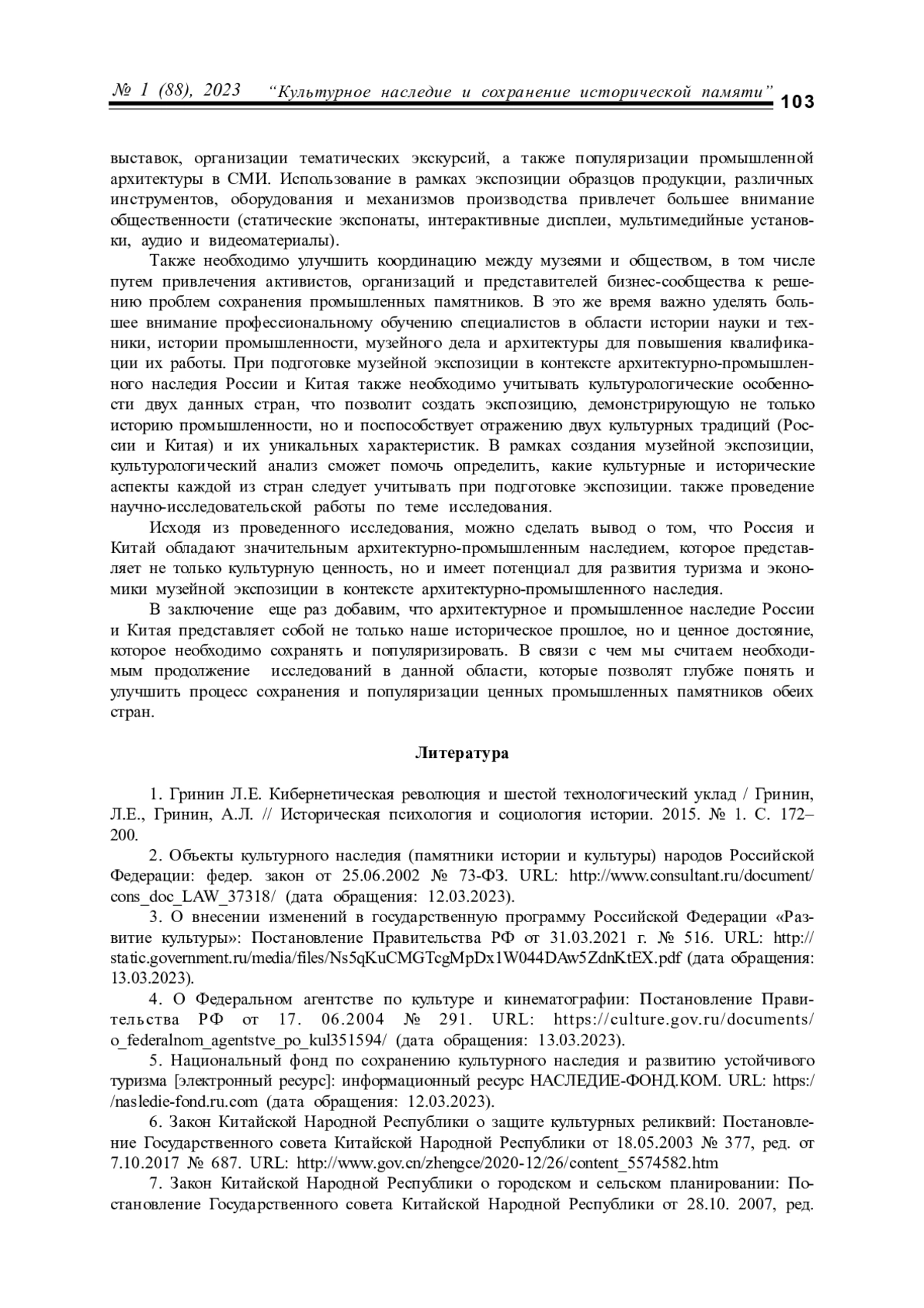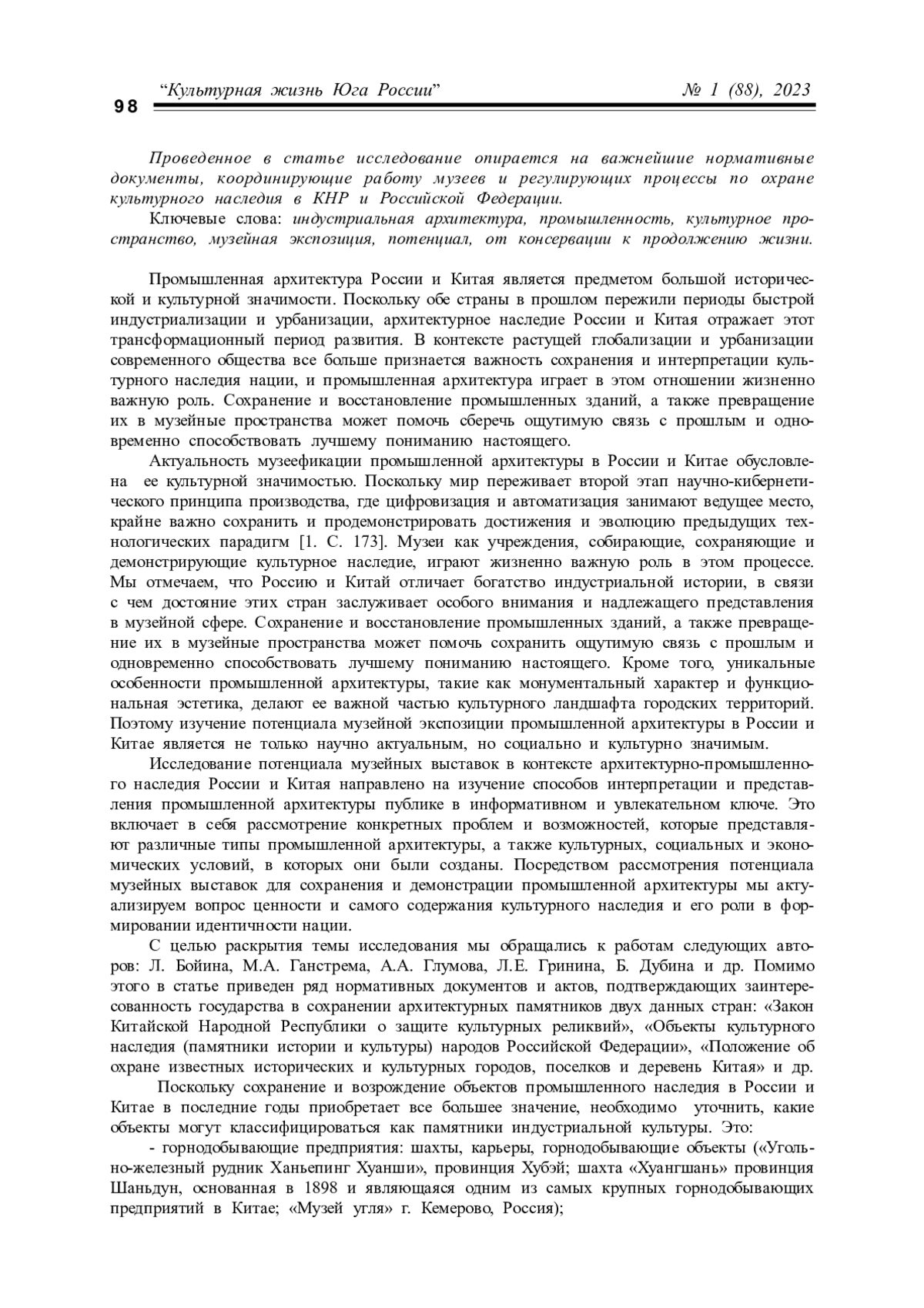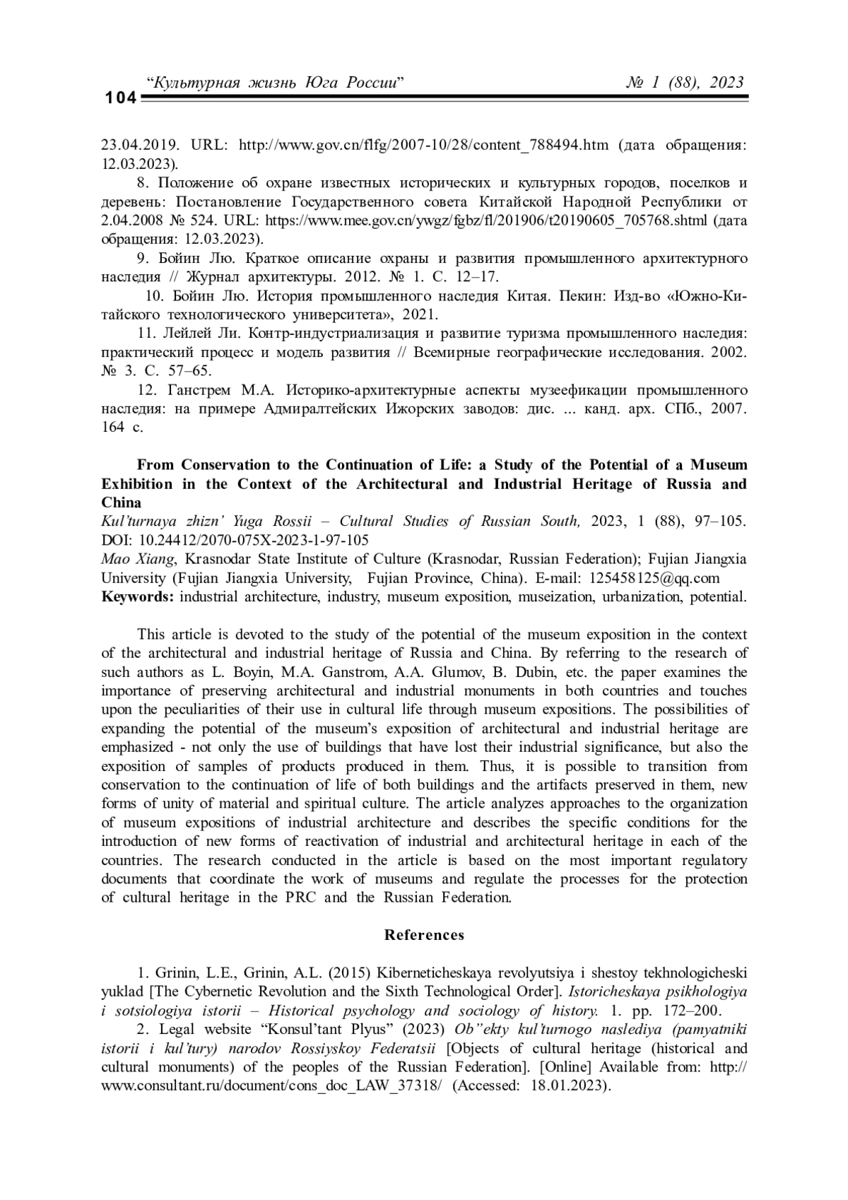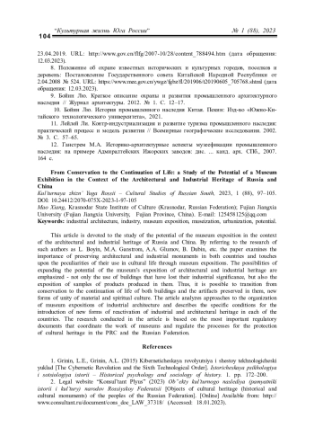 МАО С. ОТ КОНСЕРВАЦИИ К ПРОДОЛЖЕНИЮ ЖИЗНИ: ИССЛЕДОВАНИЕ ПОТЕНЦИАЛА МУЗЕЙНОЙ ЭКСПОЗИЦИИ В КОНТЕКСТЕ АРХИТЕКТУРНО-ПРОМЫШЛЕННОГО НАСЛЕДИЯ РОССИИ И КИТАЯ // КУЛЬТУРНАЯ ЖИЗНЬ ЮГА РОССИИ. 2023. № 1 (88)