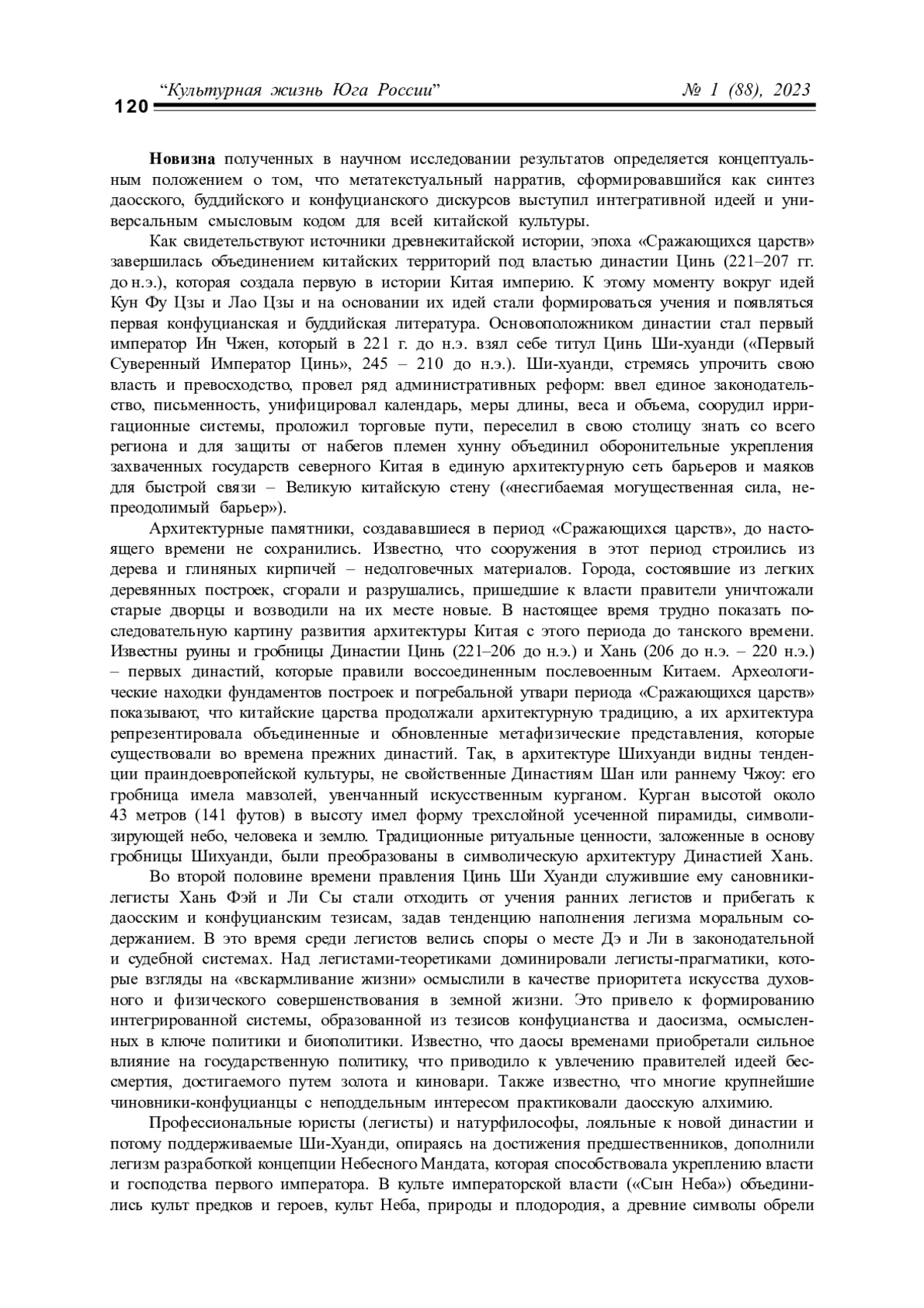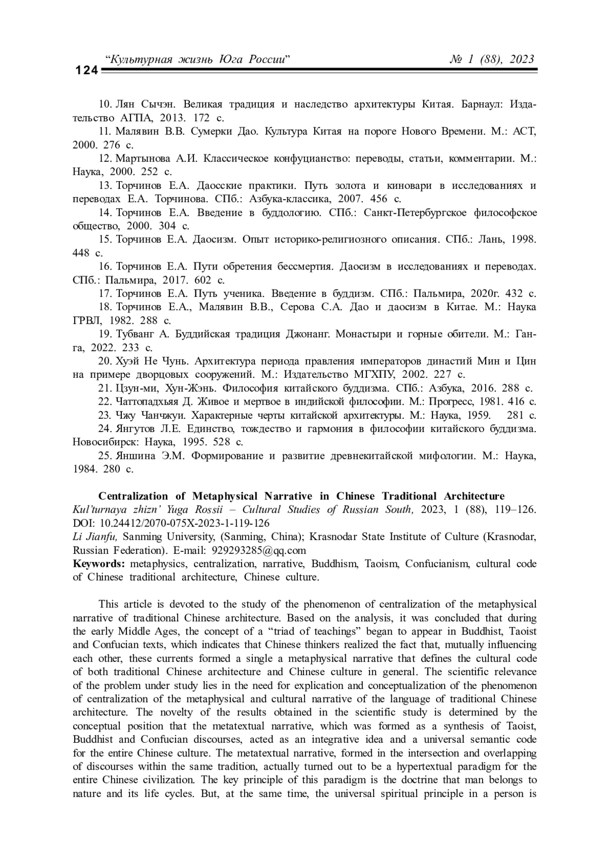Статья посвящена изучению феномена централизации метафизического нарратива традиционной архитектуры Китая. На основании проведенного анализа сделан вывод о том, что в период раннего Средневековья в буддийских, даосских и конфуцианских текстах стало фигурировать понятие «триады учений», что свидетельствует об осознании китайскими мыслителями того факта, что, взаимно влияя друг на друга, эти течения сформировали единый метафизический нарратив, определяющий культурный код как традиционной архитектуры Китая, так и китайской культуры в целом.