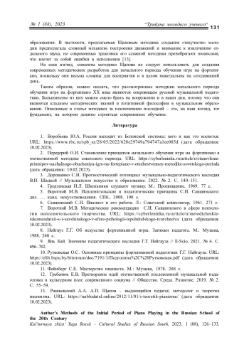 2. Передерий О.И. Становление принципов начального обучения игре на фортепиано в отечественной методике советского периода URL: https://cyberleninka.ru/article/n/stanovlenie-printsipov-nachalnogo-obucheniya-igre-na-fortepiano-v-otechestvennoy-metodike-sovetskogo-perioda (дата обращения: 10.02.2023).