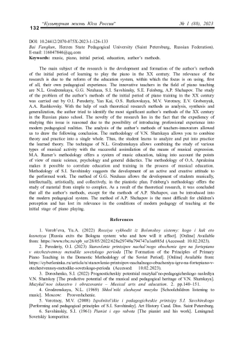 Актуальность темы исследования обусловлена тем, что российское образование достаточно часто находится на стадии реформирования. Долгий этап советского образования сменился Болонской системой. Изменение образовательных стандартов, внедрение термина «компетенции» вместо знаний, умений и навыков – вот лишь немногий перечень нововведений за последние десятилетия. 24 мая 2022 года министр науки и высшего образования В. Н. Фальков заявил о выходе России из Болонской системы образования [1]. По мнению российских ученых, отечественная педагогика должна опираться на собственные пути развития. Несомненно, это повлечет за собой новое реформирование в системе высшего образования. Главной целью исследования является изучить влияние авторских методик начального периода обучения на развитие фортепианного искусства XX века в целом. Наша задача заключается в том, чтобы сконцентрироваться на положительном опыте педагоговноваторов прошлого с целью внедрения его в настоящем