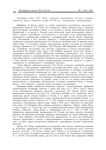 Введение. В Китае одним из самых популярных российских писателей и драматургов является А. П. Чехов. Его творчество играет большую роль в развитии русско-китайских культурных связей, а его изучение в призме рассмотрения культуры Поднебесной и ее диалога с Россией стало актуальной темой исследований ученых в обеих странах. Российские исследователи в последние годы преимущественно интересуются особенностями переводов и интерпретацией текстов Чехова. Например, О. Н. Мельникова и В. А. Белодед выявили и охарактеризовали лингвистические особенности переводов произведений А. П. Чехова на китайский язык на примере пьесы «Дядя Ваня». К изучению влияния произведений русского писателя на китайскую культуру обращались Е. А. Серебряков, Цуй Юньюнь, Ши Шаньшань, Б. В. Кондаков и др. Специфику постановок пьес русского драматурга в Китае рассматривал в диссертации Лю Цзякун. Цинь Дань и Ян Хайбинь сравнили пьесы А. П. Чехова с традициями китайской драмы. Проблемам восприятия драматургии А. П. Чехова в китайской критике и литературоведении XX века посвящали диссертации на русском языке Шэн Хайтао и Цзян Чжиянь. Китайские исследователи Чжу Исэнь, Ли Чэньминь и Тонг Даомин изучали вопросы распространения творчества писателя в стране в зависимости от исторического и культурного контекста
