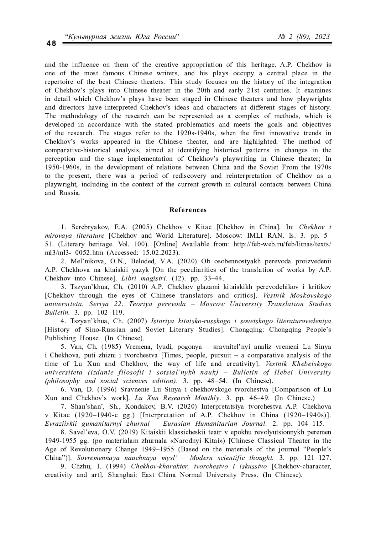 7. Шаньшань Ш., Кондаков Б.В. Интерпретация творчества А.П. Чехова в Китае (1920-1940-е гг.) // Евразийский гуманитарный журнал. 2020. № 2. С. 104-115. EDN: PUHCAW
