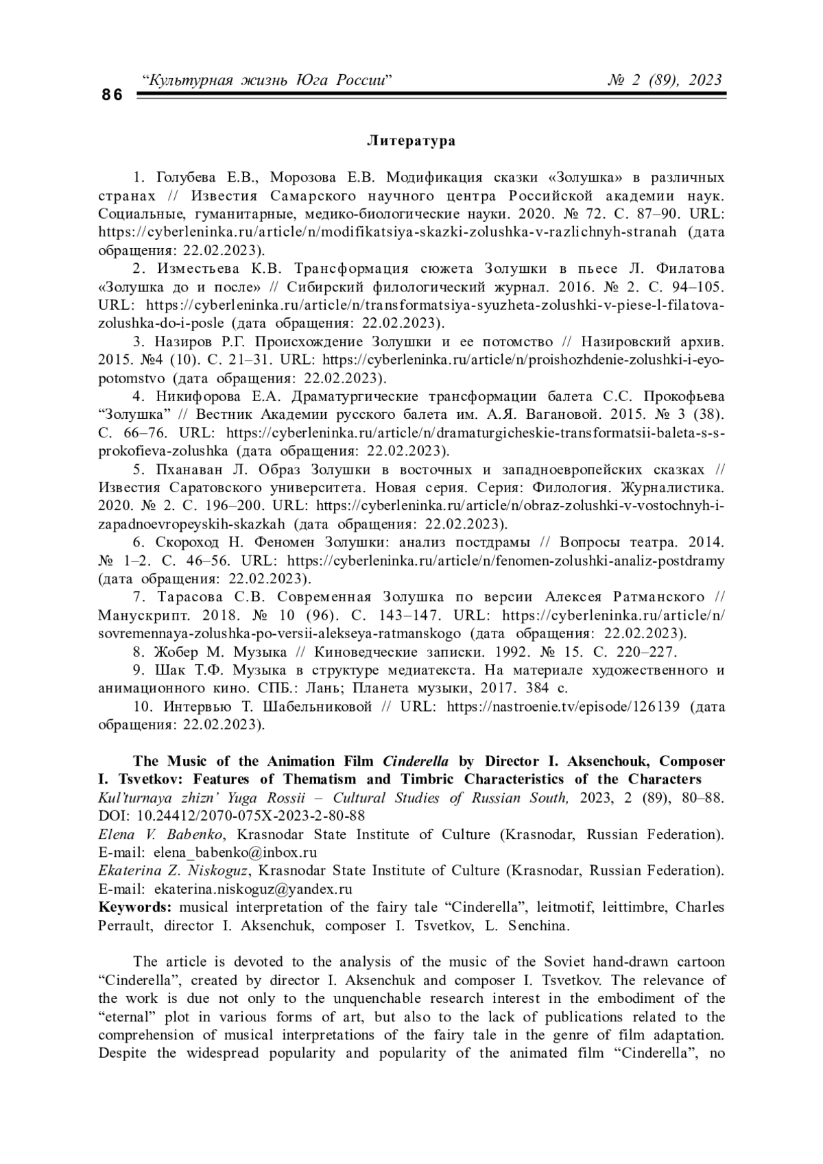 1. Голубева Е.В., Морозова Е.В. Модификация сказки “Золушка” в различных странах // Известия Самарского научного центра Российской академии наук. Социальные, гуманитарные, медико-биологические науки. 2020. №72. С. 87-90.URL: https://cyberleninka.ru/article/n/modifikatsiya-skazki-zolushka-v-razlichnyh-stranah (дата обращения: 22.02.2023). EDN: QVXXWU