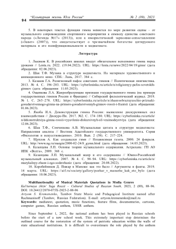 C 1 сентября 2022 года в школах России перед началом новой учебной недели исполняется государственный гимн [1]. Этот чрезвычайно важный шаг определяет наметившийся курс на восстановление системы патриотического воспитания в стенах государственных образовательных учреждений. Трудно переоценить роль, которую играет гимн в процессе формирования личности, национальной и гражданской идентичности, что определяет актуальность данной статьи, включающую обзор-ретроспективу и анализ принципов функционирования музыкального материала гимна России в различных медиажанрах: художественном и документальном кинематографе, мультфильмах и анимации, компьютерных играх