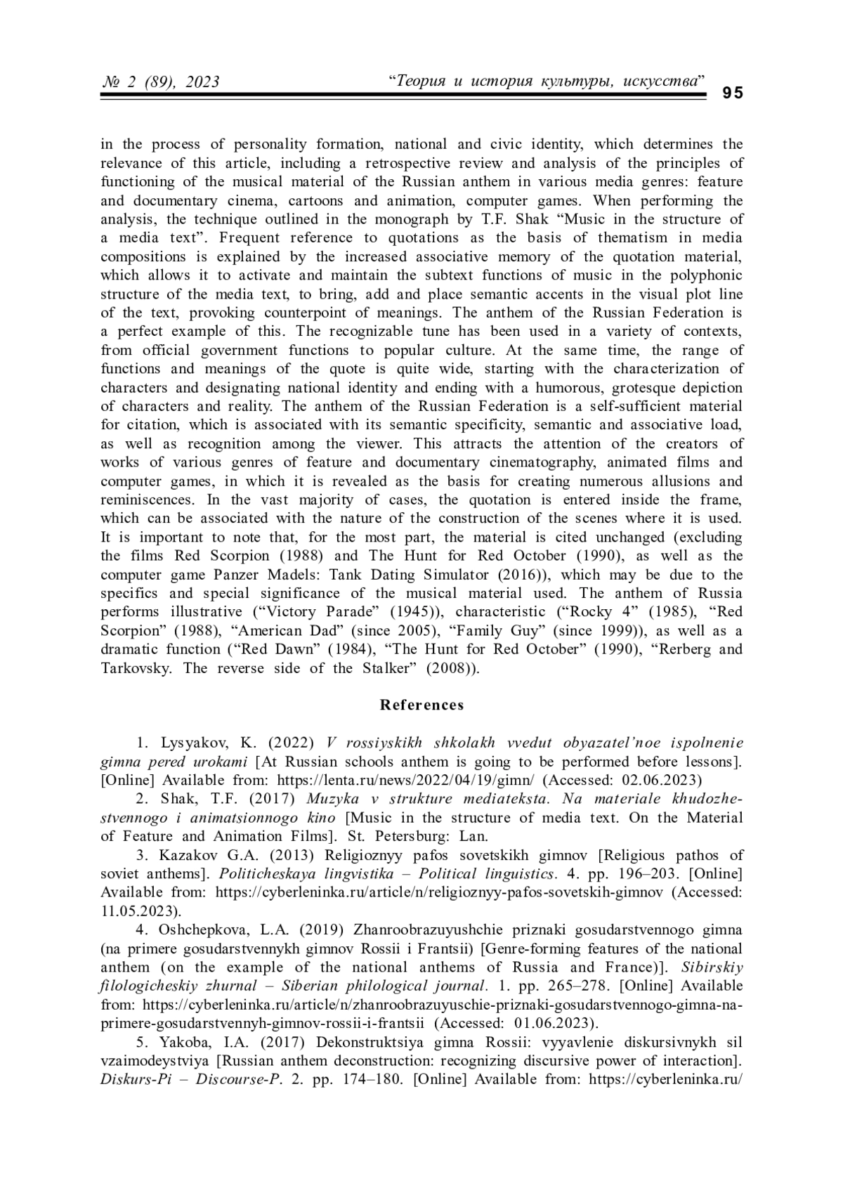 3. Казаков Г.А. Религиозный пафос советских гимнов // Политическая лингвистика. 2013. № 4. С. 196-203. URL: https://cyberleninka.ru/article/n/religioznyy-pafos-sovetskih- gimnov (дата обращения: 11.05.2023). EDN: RSOTNN