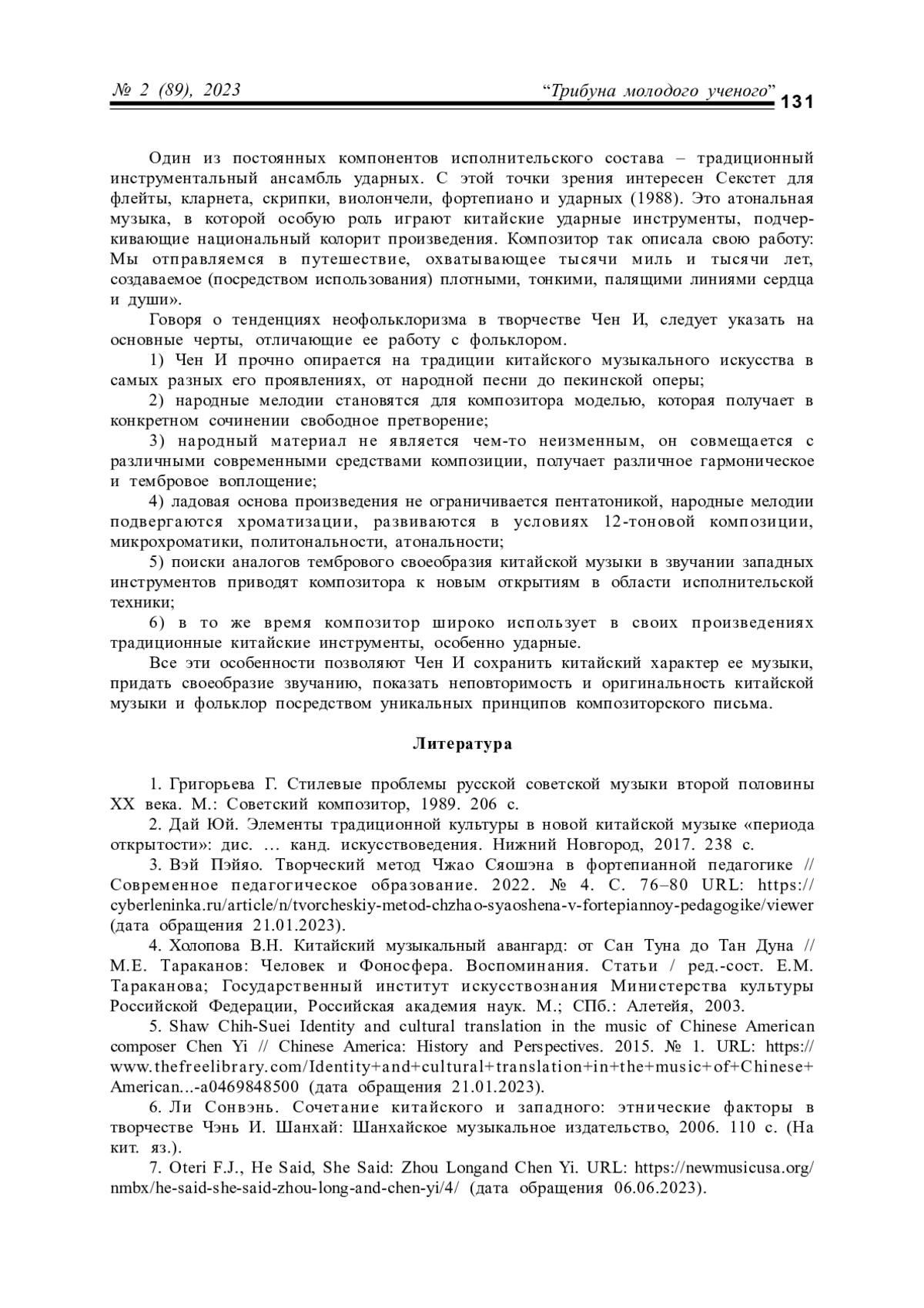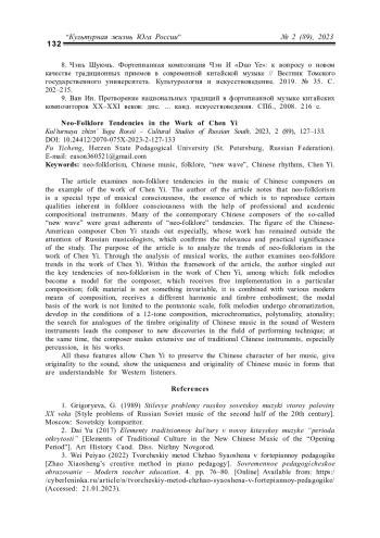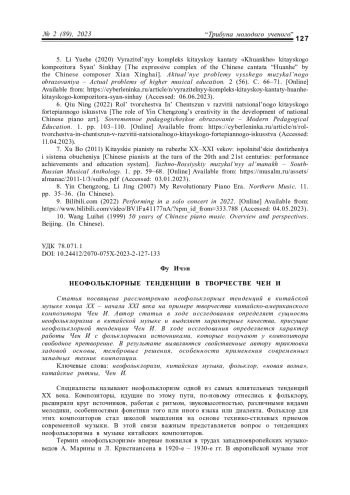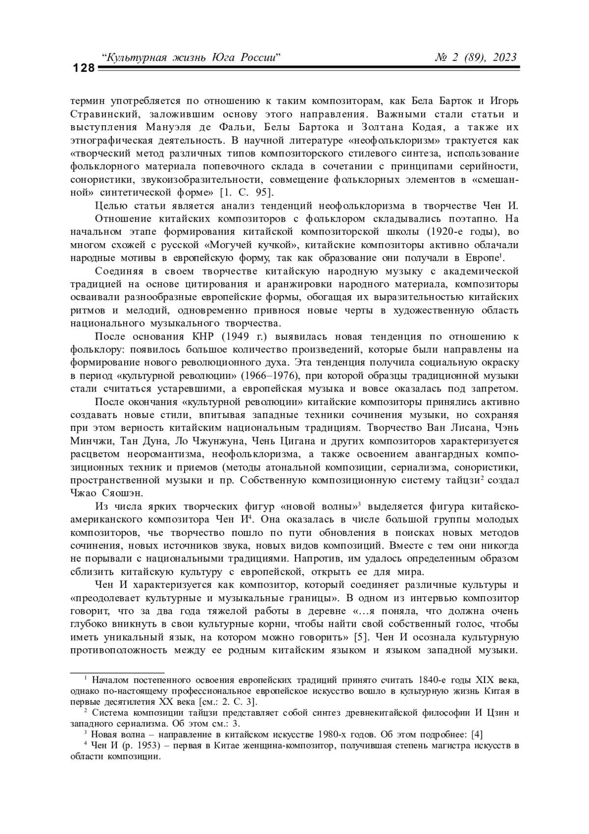 ФУ И. НЕОФОЛЬКЛОРНЫЕ ТЕНДЕНЦИИ В ТВОРЧЕСТВЕ ЧЕН И // КУЛЬТУРНАЯ ЖИЗНЬ ЮГА РОССИИ. 2023. № 2 (89)