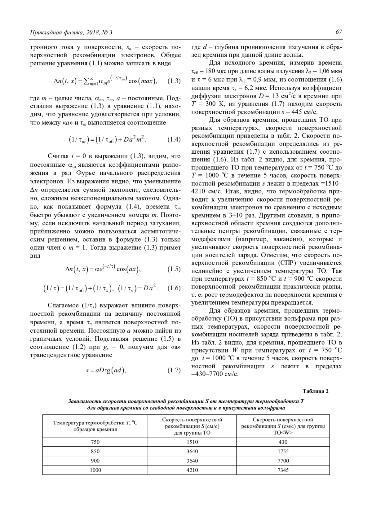 - Термообработка кремния в присутствии вольфрама увеличивает скорость поверхностной рекомбинации носителей заряда в 4–17 раз по сравнению с СПР исходного кремния. Влияние вольфрама состоит в усиливающем эффекте на скорость поверхностной рекомбинации носителей заряда по сравнению с СПР исходного кремния начиная с температуры t = 850 оС.