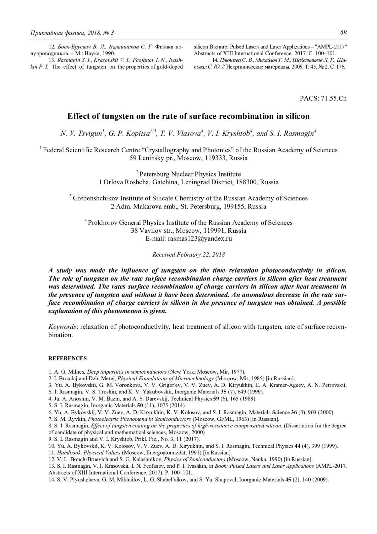 13. Rasmagin S. I., Krasovskii V. I., Feofanov I. N., Ivashkin P. I. The effect of tungsten on the properties of gold-doped silicon В книге: Pulsed Lasers and Laser Applications – “AMPL-2017” Abstracts of XIII International Conference. 2017. С. 100–101.