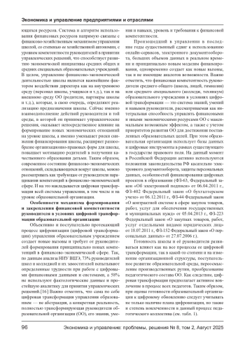 В статье исследуются ключевые аспекты развития финансовой компетентности руководителей образовательных учреждений в условиях цифровой трансформации. Особое внимание уделяется необходимости формирования комплексных навыков работы с современными финансовыми системами, включая аналитику данных, цифровую безопасность и стратегическое планирование ресурсов. Рассматриваются основные вызовы цифровизации, требующие принципиально новых подходов к управлению образовательными организациями. Также анализируются ключевые проблемы, препятствующие эффективному финансовому управлению: недостаточная технологическая оснащенность, дефицит специализированных образовательных программ, консервативность управленческих подходов и динамично меняющееся законодательное поле. Подчеркивается, что преодоление этих барьеров требует системных изменений в подготовке управленческих кадров и создания условий для их профессионального роста. Проведенный в статье сравнительный анализ отечественного и зарубежного опыта формирования финансовой компетентности у руководителей средних образовательных учреждений демонстрирует преимущества децентрализованных моделей управления, ориентированных на прогнозную аналитику и адаптацию к локальным условиям. Особый акцент делается на необходимости трансформации управленческой культуры и развития стратегического мышления у руководителей образовательных организаций. Статья подтверждает, что развитие финансовой компетентности становится критически важным фактором устойчивого развития образовательных учреждений в цифровую эпоху. Эффективное управление ресурсами напрямую влияет на качество и доступность образования, что требует пересмотра подходов к подготовке управленческих кадров и формированию современной образовательной инфраструктуры.