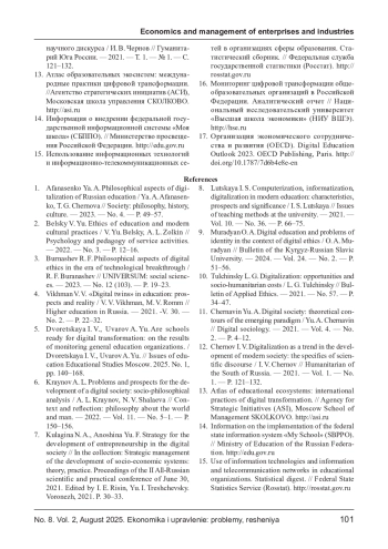 1. Афанасенко Я. А. Философские аспекты цифровизации российского образования / Я. А. Афанасенко, Т. Г. Чернова // Общество: философия, история, культура. - 2023. - № 4. - С. 49-57. EDN: EMXDXW