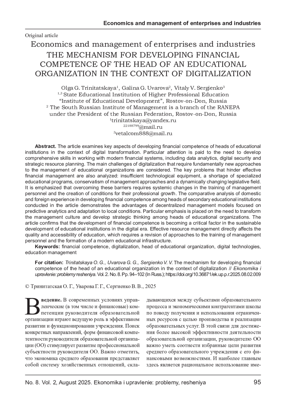 5. Дворецкая И.В., Уваров А. Ю. Готовы ли школы к цифровой трансформации: о результатах мониторинга общеобразовательных организаций./ Дворецкая И. В., Уваров А. Ю. //Вопросы образования Educational Studies Moscow. 2025. № 1, с. 140-168.