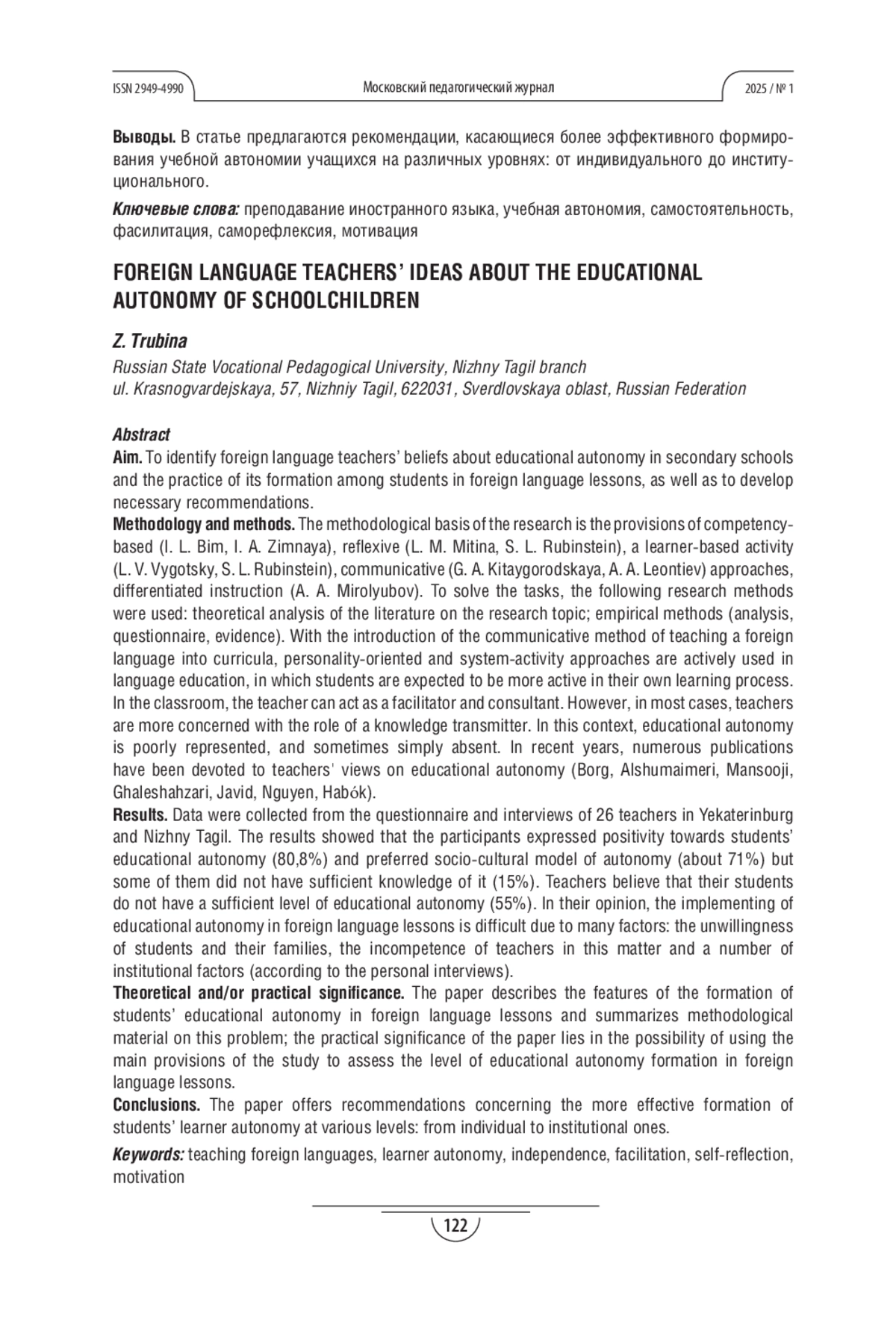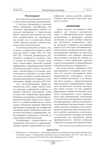 Выводы. В статье предлагаются рекомендации, касающиеся более эффективного формирования учебной автономии учащихся на различных уровнях: от индивидуального до институционального.