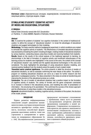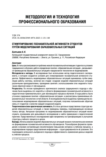 Методология и методы. В исследовании был использован метод педагогического эксперимента, в котором создаются условия для стимулирования познавательной активности студентов. Эффективность моделируемых образовательных ситуаций оценивалась путём симуляции работы системы, включая все стадии: создание моделей образовательных ситуаций различными преподавателями, проведение занятий с использованием этих моделей и получение обратной связи от обучающихся. Результаты. По итогам проведённого критического анализа традиционного подхода к обучению были выделены его недочёты в области формирования познавательной активности и недостаточная привлекательность для обучающихся процесса обучения. В ходе работы было уточнено содержания понятия «образовательная ситуация» и рассмотрены применяемые образовательные технологии в этой области. В исследовании были выделены преимущества использования моделирования образовательных ситуаций, получена положительная обратная связь от студентов о качестве каждой созданной модели.