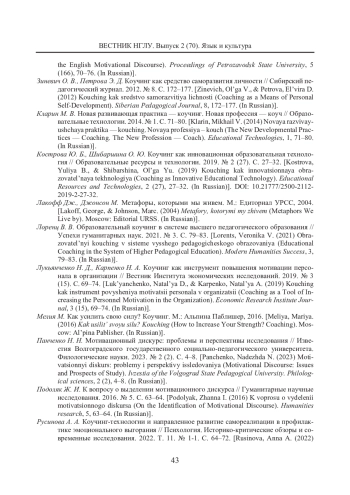 7. Зиневич О. В., Петрова Э. Д. Коучинг как средство саморазвития личности // Сибирский педагогический журнал. 2012. № 8. С. 172-177. EDN: PMQCGD