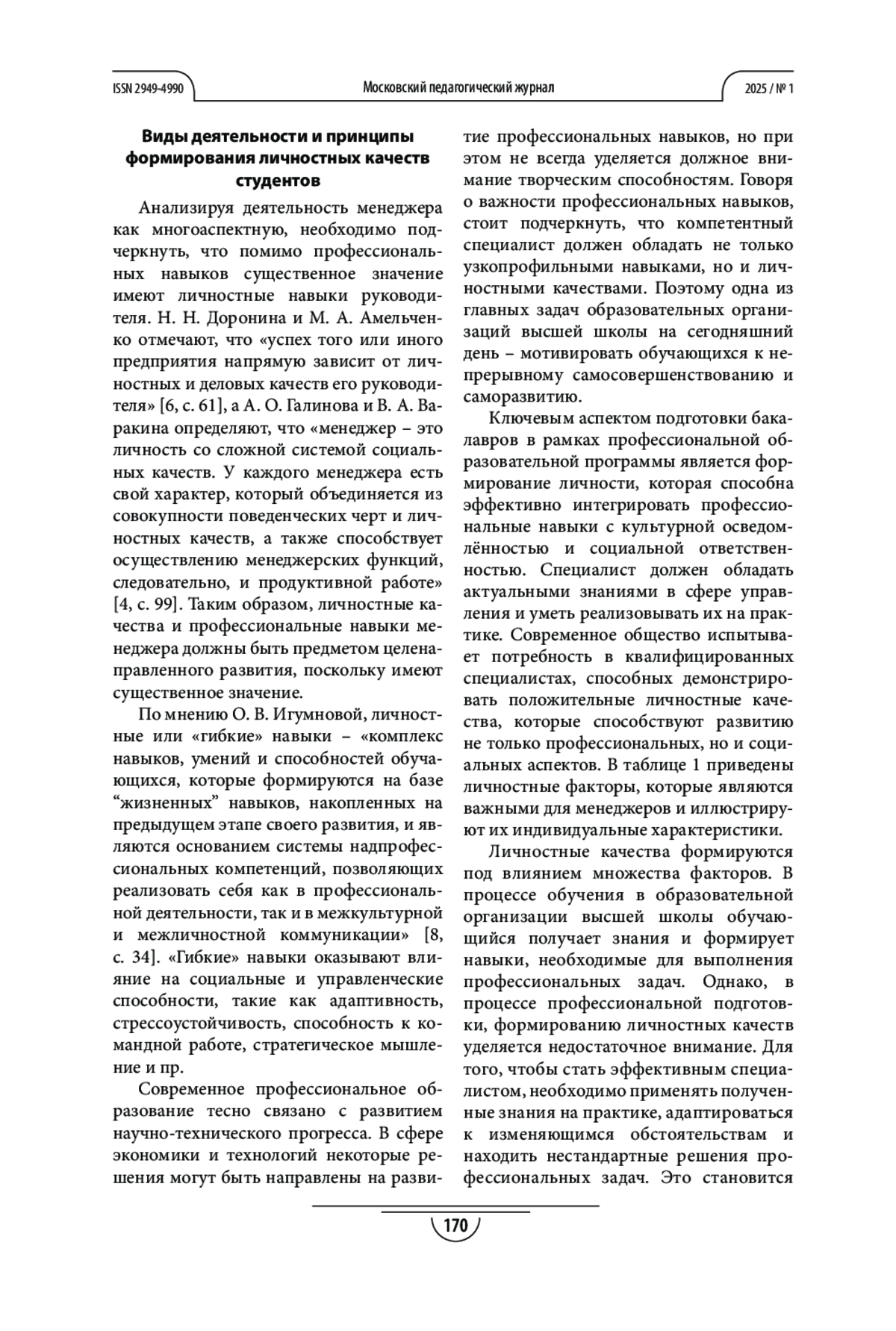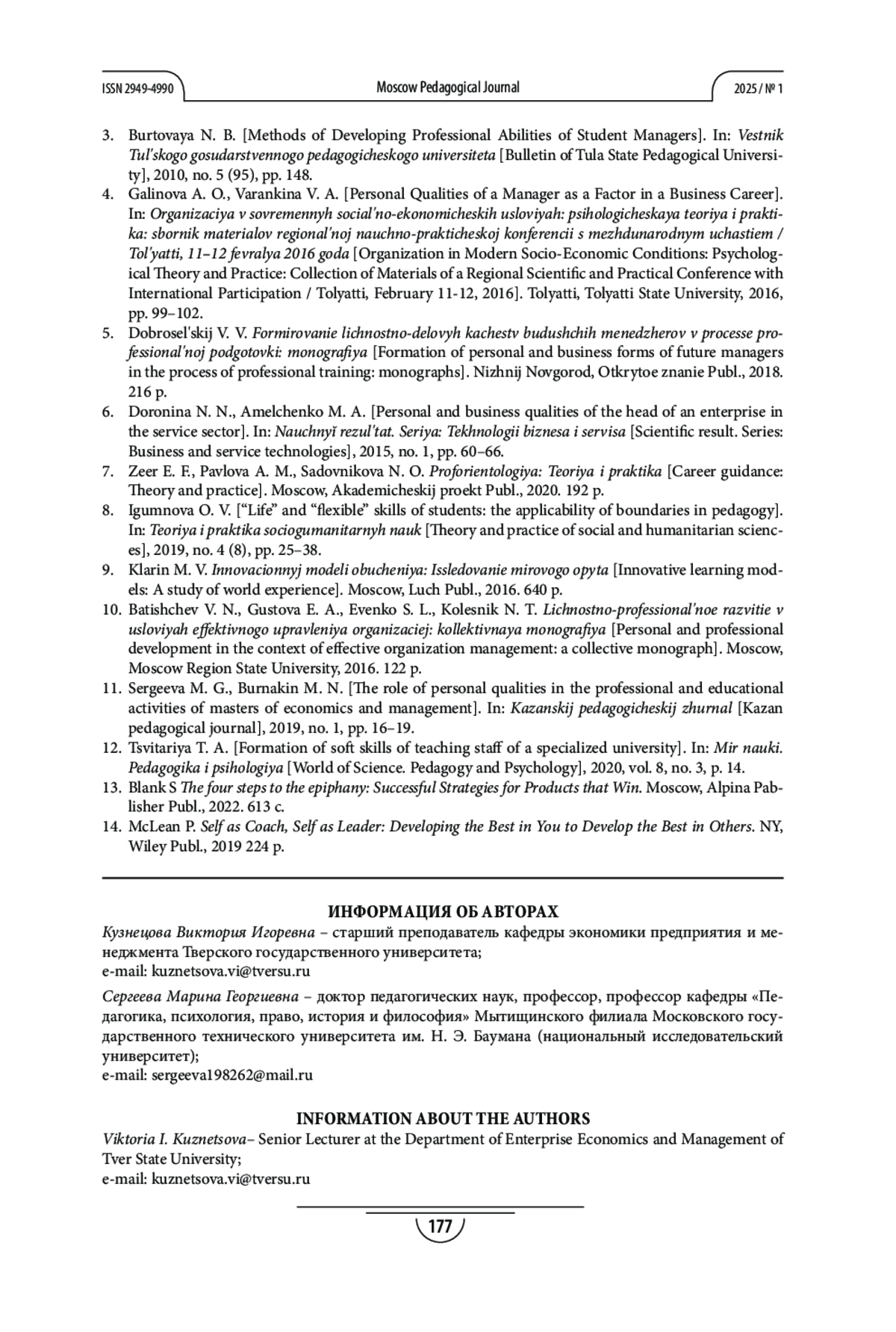 11. Сергеева М. Г., Бурнакин М. Н. Роль личностных качеств в профессиональной и учебной деятельности магистров экономики и менеджмента // Казанский педагогический журнал. 2019. №1. С. 16-19. EDN: YUJHML