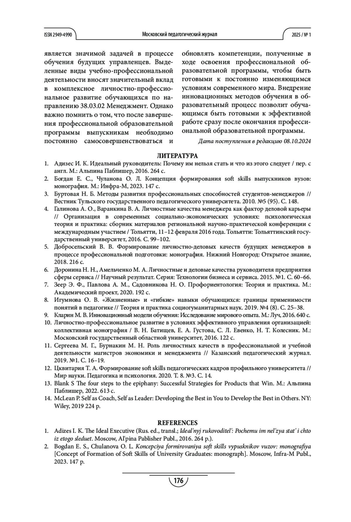 2. Богдан Е. С., Чуланова О. Л. Концепция формирования soft skills выпускников вузов: монография. М.: Инфра-М, 2023. 147 с. EDN: HJIVEQ