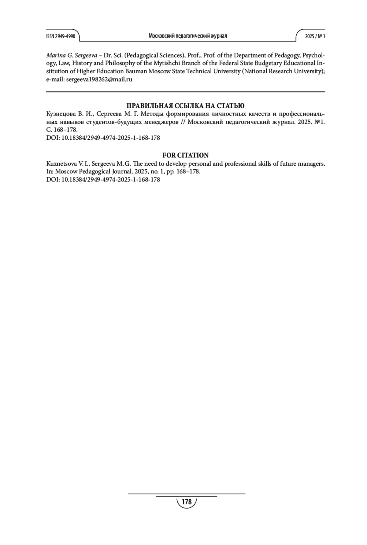 5. Добросельский В. В. Формирование личностно-деловых качеств будущих менеджеров в процессе профессиональной подготовки: монография. Нижний Новгород: Открытое знание, 2018. 216 с. EDN: YQIQCK