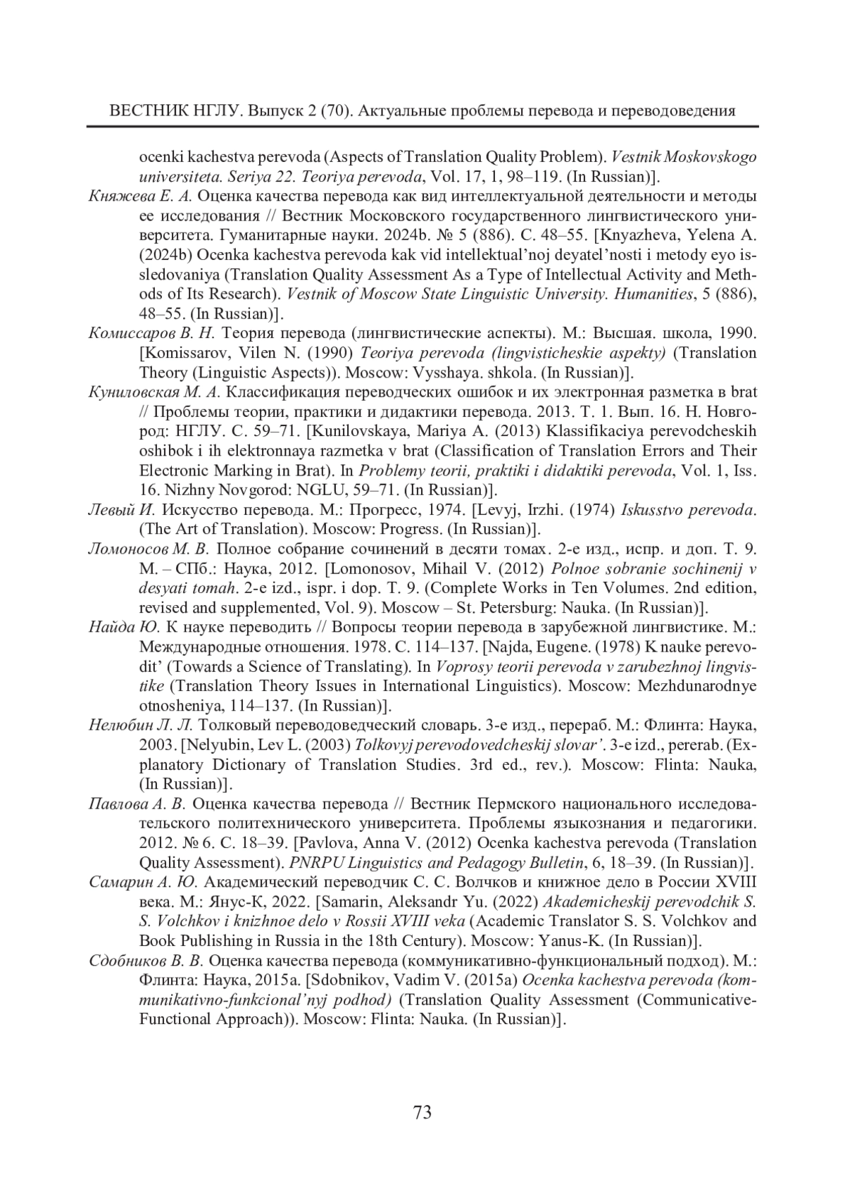 10. Княжева Е. А. О некоторых аспектах исследования проблемы оценки качества перевода // Вестник Московского университета. Серия 22. Теория перевода. 2024а. Т. 17. № 1. С. 98-119. EDN: JSJNFW