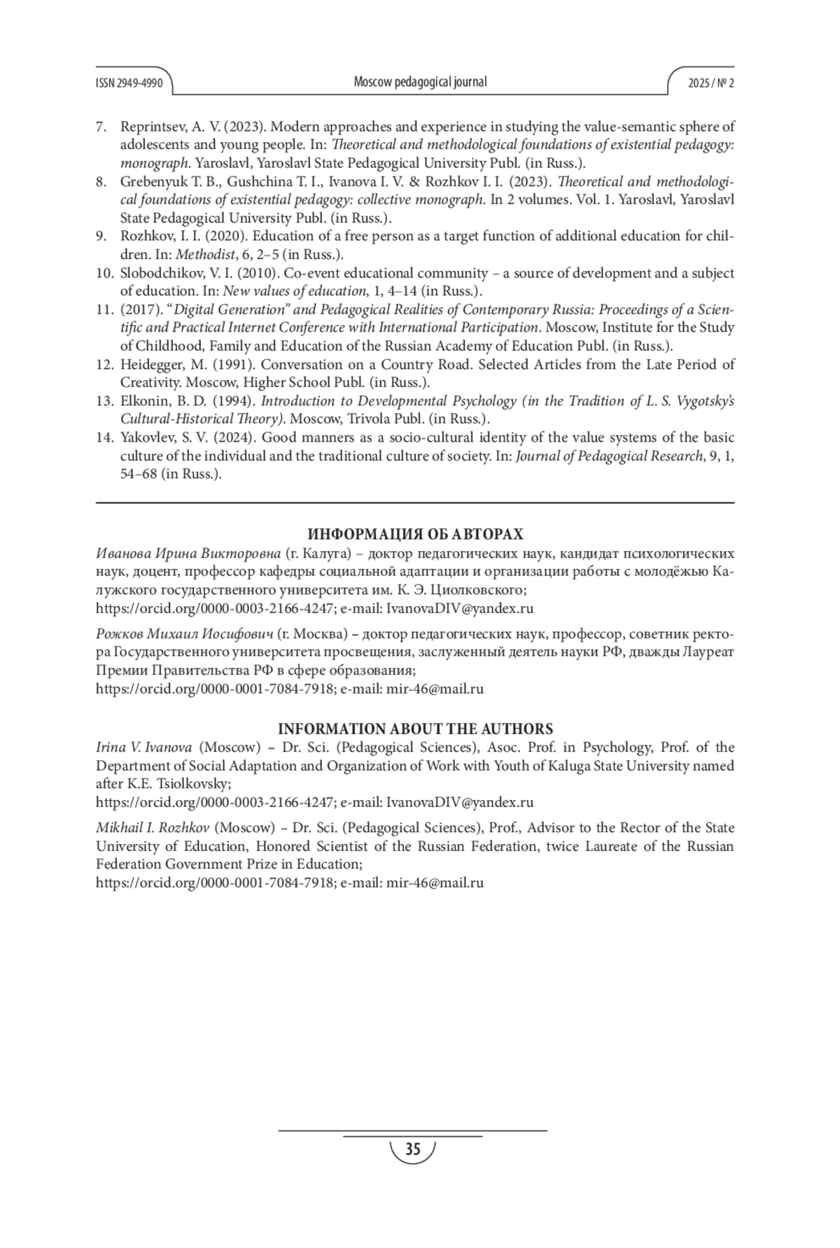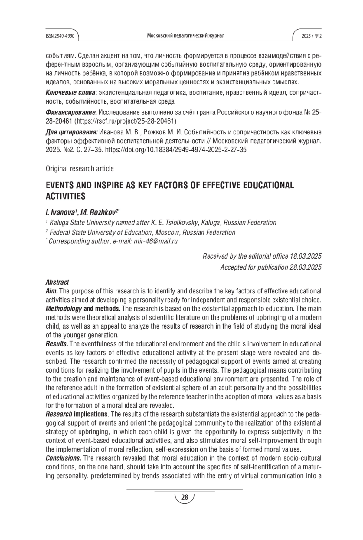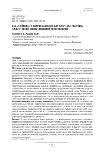 ИВАНОВА И. В., РОЖКОВ М. И. СОБЫТИЙНОСТЬ И СОПРИЧАСТНОСТЬ КАК КЛЮЧЕВЫЕ ФАКТОРЫ ЭФФЕКТИВНОЙ ВОСПИТАТЕЛЬНОЙ ДЕЯТЕЛЬНОСТИ // МОСКОВСКИЙ ПЕДАГОГИЧЕСКИЙ ЖУРНАЛ. 2025. № 2