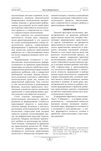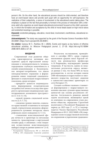 Выводы. В ходе исследования было выявлено, что нравственное воспитание в контексте современных социокультурных условий, с одной стороны, должно учитывать специфику самоидентификации взрослеющей личности, предопределённую тенденциями, связанными с вхождением в жизнь человека средств виртуальной коммуникации. С другой стороны, воспитательный процесс должен быть ориентирован на ребёнка, а значит, носить событийный характер и предоставлять возможность каждому воспитаннику для самовыражения, реализации им своей субъектности, ощущения сопричастности к происходящим воспитательным событиям. Сделан акцент на том, что личность формируется в процессе взаимодействия с референтным взрослым, организующим событийную воспитательную среду, ориентированную на личность ребёнка, в которой возможно формирование и принятие ребёнком нравственных идеалов, основанных на высоких моральных ценностях и экзистенциальных смыслах.
