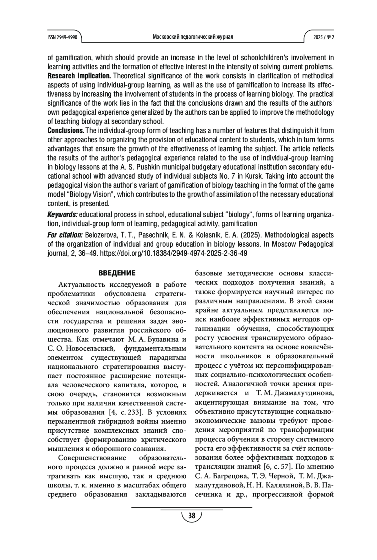 3. Белозерова Т. Н. Организация индивидуально-групповой учебно-познавательной деятельности учащихся в классах с углублённым изучением биологии // Развитие естественных наук и образования в России. Химия, биология, география, экология, образование: материалы Всероссийской научно-практической конференции памяти учёного-энциклопедиста Д. И. Менделеева (Москва, 16 февраля 2024 года). М.: ГУП, 2024. С. 191-194. EDN: PXPFBD