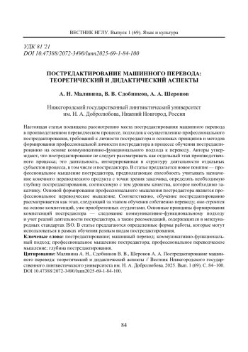Настоящая статья посвящена рассмотрению места постредактирования машинного перевода в производственном переводческом процессе, подходов к осуществлению профессионального постредактирования, требований к личности постредактора и основных принципов и методов формирования профессиональной личности постредактора в процессе обучения постредактированию на основе коммуникативно-функционального подхода к переводу. Авторы утверждают, что постредактирование не следует рассматривать как отдельный этап производственного процесса; это деятельность, интегрированная в структуру деятельности отдельных субъектов процесса, в том числе и постредактора. В статье предлагается новое понятие - профессиональное мышление постредактора, предполагающее способность учитывать назначение конечного переводческого продукта с точки зрения заказчика, определять необходимую глубину постредактирования, соотносимую с тем уровнем качества, которое необходимо заказчику. Основой формирования профессионального мышления постредактора является профессиональное переводческое мышление. Соответственно, обучение постредактированию рассматривается как этап, следующий за этапом обучения собственно переводу; оно строится на основе компетенций, уже приобретенных студентами. Основные принципы формирования компетенций постредактора - следование коммуникативно-функциональному подходу и учет реалий деятельности постредактора, а также рекомендаций, содержащихся в международных стандартах ISO. В статье предлагаются определенные формы работы, которые могут использоваться в рамках обучения разным видам постредактирования.