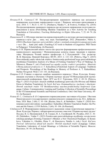 11. Нечаева Н. В., Светова С. Ю. Постредактирование машинного перевода как актуальное направление подготовки переводчиков в вузах // Вопросы методики преподавания в вузе. 2018. Т. 7. № 25. С. 64-72. [Nechaeva, Natalia V., & Svetova, Svetlana Yu. (2018) Постредактирование машинного перевода как актуальное направление подготовки переводчиков в вузах (Post-Editing Machine Translation as a New Activity for Teaching Translation at Universities). Teaching Methodology in Higher Education, 7, 25, 64-74. (In Russian)]. EDN: YNATPV