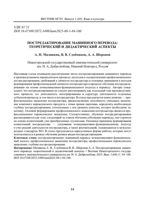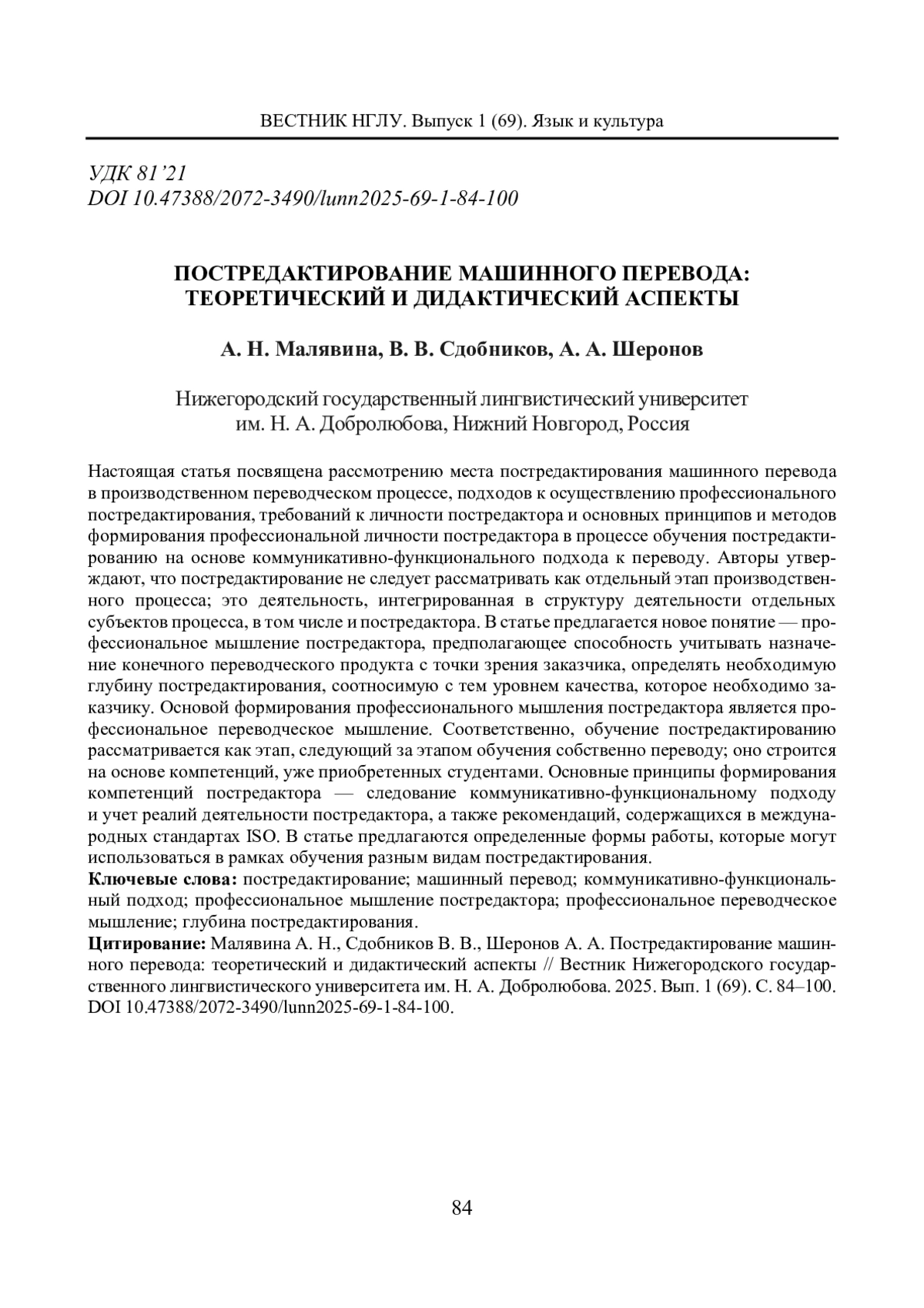 7. Малявина А. Н. Постредактирование: некоторые теоретические вопросы // Новейшая филология: современные парадигмы исследований: Сборник тезисов участников Всероссийской научно-практической конференции, посвященной памяти проф. Г. Г. Галич. Омск: ОмГУ, 2024а. С. 126-128. [Malyavina, Anna N. (2024a) Postredaktirovanie: nekotorye teoreticheskie voprosy (Post-editing: Some Theoretical Concerns). In Novejshaja filologija: sovremennye paradigmy issledovanij: Sbornik tezisov uchastnikov Vserossijskoj nauchno-prakticheskoj konferencii, posvyashchennoj pamyati prof. G. G. Galich (Modern Philology: Modern Paradigms of Research: Collection of Abstracts of Participants of the All-Russian Scientific and Practical Conference Dedicated to the Memory of Prof. G. G. Galich). Omsk: OmSU, 126-128. (In Russian)]. EDN: IUZGAE