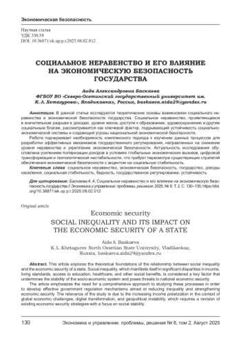 Работа подчеркивает необходимость комплексного подхода к изучению данных процессов для разработки эффективных механизмов государственного регулирования, направленных на снижение уровня неравенства и укрепление экономической безопасности. Актуальность исследования обусловлена усилением поляризации доходов в условиях глобальных экономических вызовов, цифровой трансформации и геополитической нестабильности, что требует пересмотра существующих стратегий обеспечения экономической безопасности с акцентом на социальную стабильность.