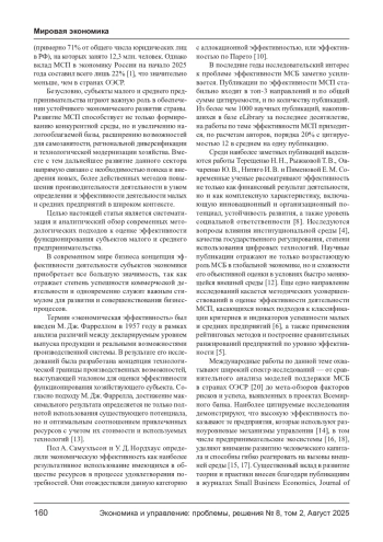 Статья посвящена обзору и сравнительному анализу международных и российских моделей оценки и повышения эффективности малого и среднего бизнеса (МСП). Определяя МСП как ключевой драйвер экономического роста и инноваций, авторы подчеркивают его значимость для занятости и диверсификации национальной экономики. Однако, несмотря на сопоставимые с ОЭСР количественные показатели, доля МСП в ВВП России на начало 2025 г. существенно отстает от развитых стран (22% против 50-60%), что и формулирует основную проблему исследования - поиск и адаптация эффективных методов измерения и повышения производительности данного сектора.