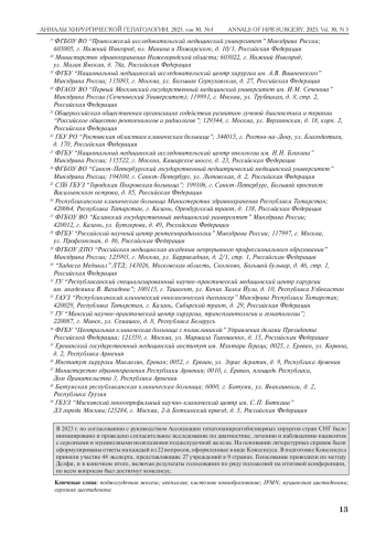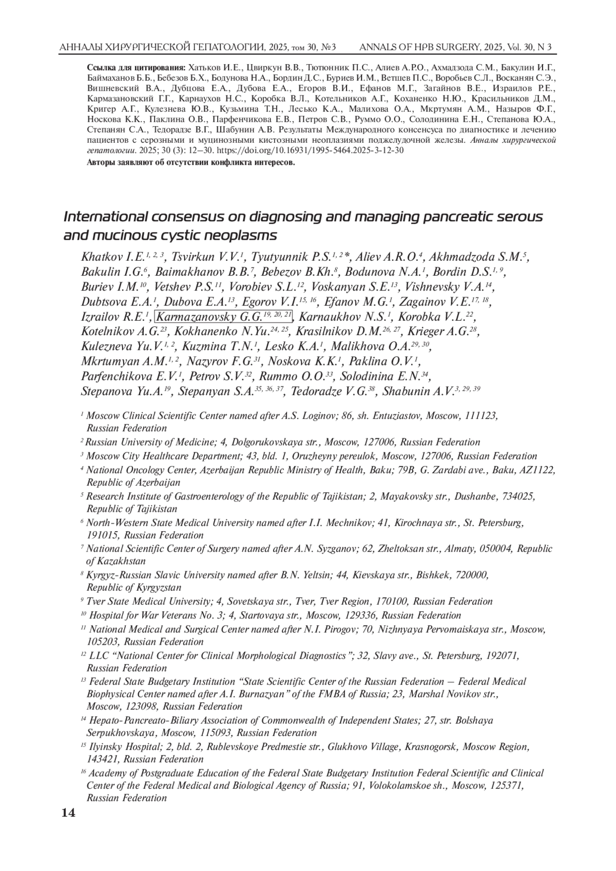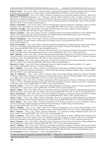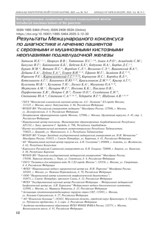 В 2023 г. по согласованию с руководством Ассоциации гепатопанкреатобилиарных хирургов стран СНГ было инициировано и проведено согласительное исследование по диагностике, лечению и наблюдению пациентов с серозными и муцинозными неоплазиями поджелудочной железы. На основании литературных справок были сформулированы ответы на каждый из 22 вопросов, оформленные в виде Консенсуса. В подготовке Консенсуса приняли участие 44 эксперта, представляющие 27 учреждений в 9 странах. Голосование проводили по методу Делфи, и в конечном итоге, включая результаты голосования по ряду положений на итоговой конференции, по всем вопросам был достигнут консенсус.