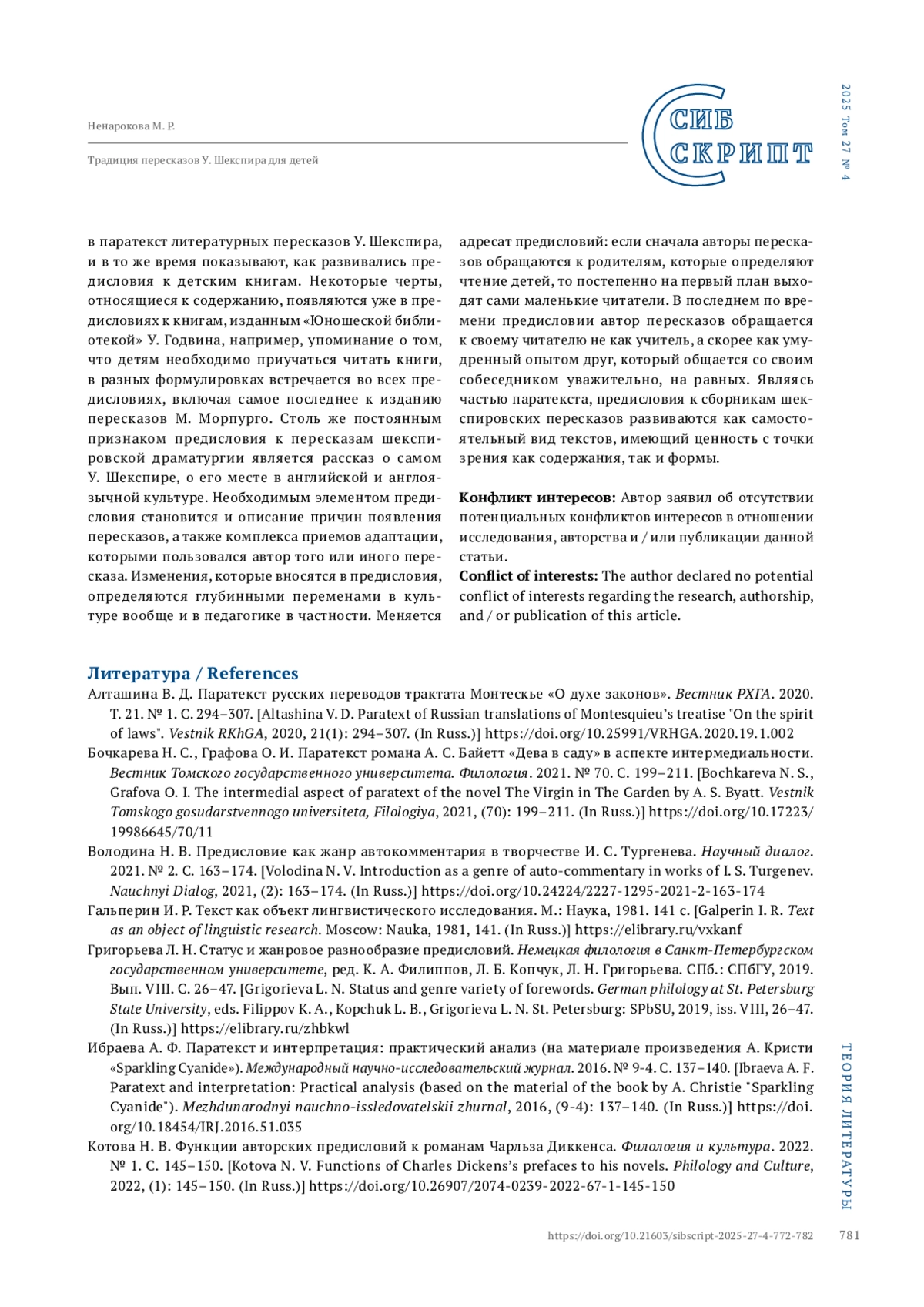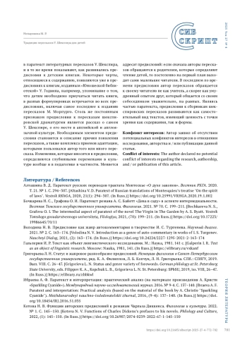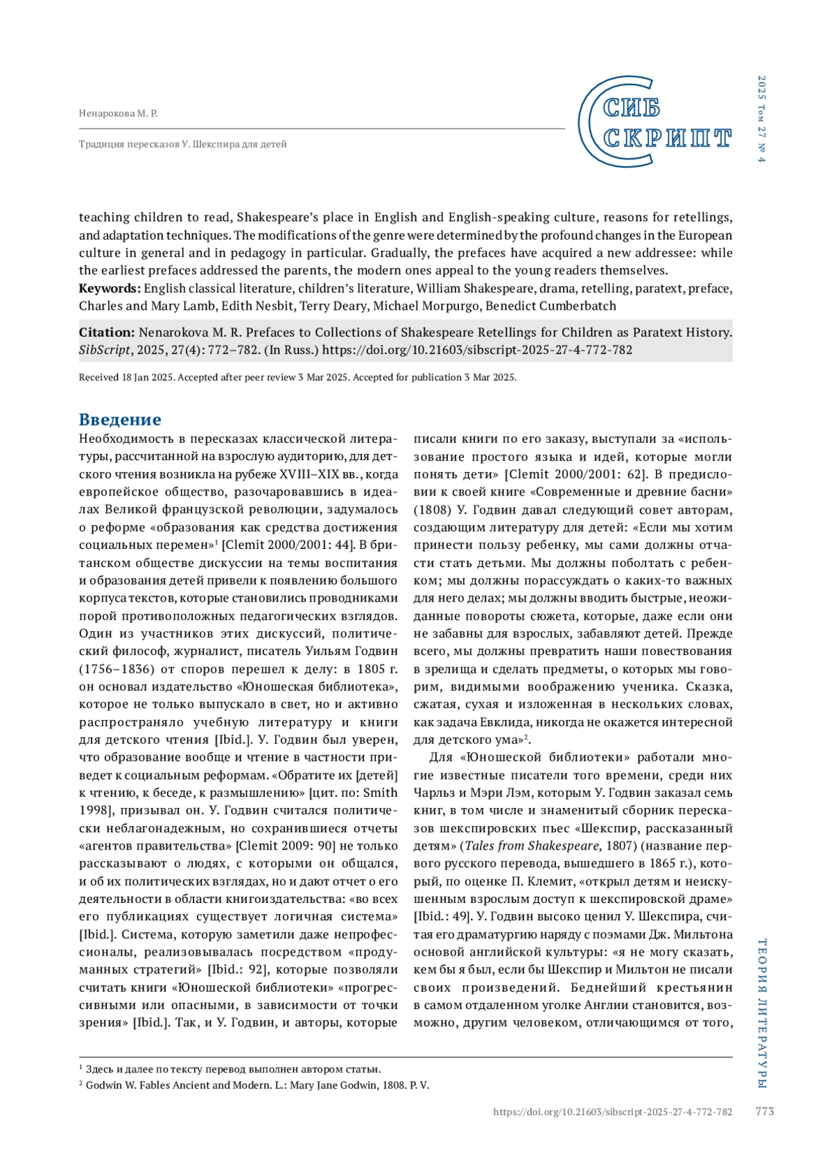 НЕНАРОКОВА М. Р. ТРАДИЦИЯ ПЕРЕСКАЗОВ У. ШЕКСПИРА ДЛЯ ДЕТЕЙ: ОСОБЕННОСТИ ПАРАТЕКСТА (НА ПРИМЕРЕ ПРЕДИСЛОВИЙ К СБОРНИКАМ) // СИБСКРИПТ. 2025. Т. 27, № 4