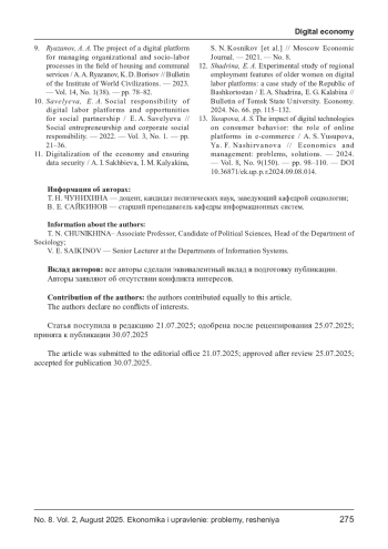 12. Шадрина, Е. А. Экспериментальное исследование региональных особенностей занятости женщин старших возрастов на цифровых трудовых платформах: кейс Республики Башкортостан / Е. А. Шадрина, Е. Г. Калабина // Вестник Томского государственного университета. Экономика. - 2024. - № 66. - С. 115-132.