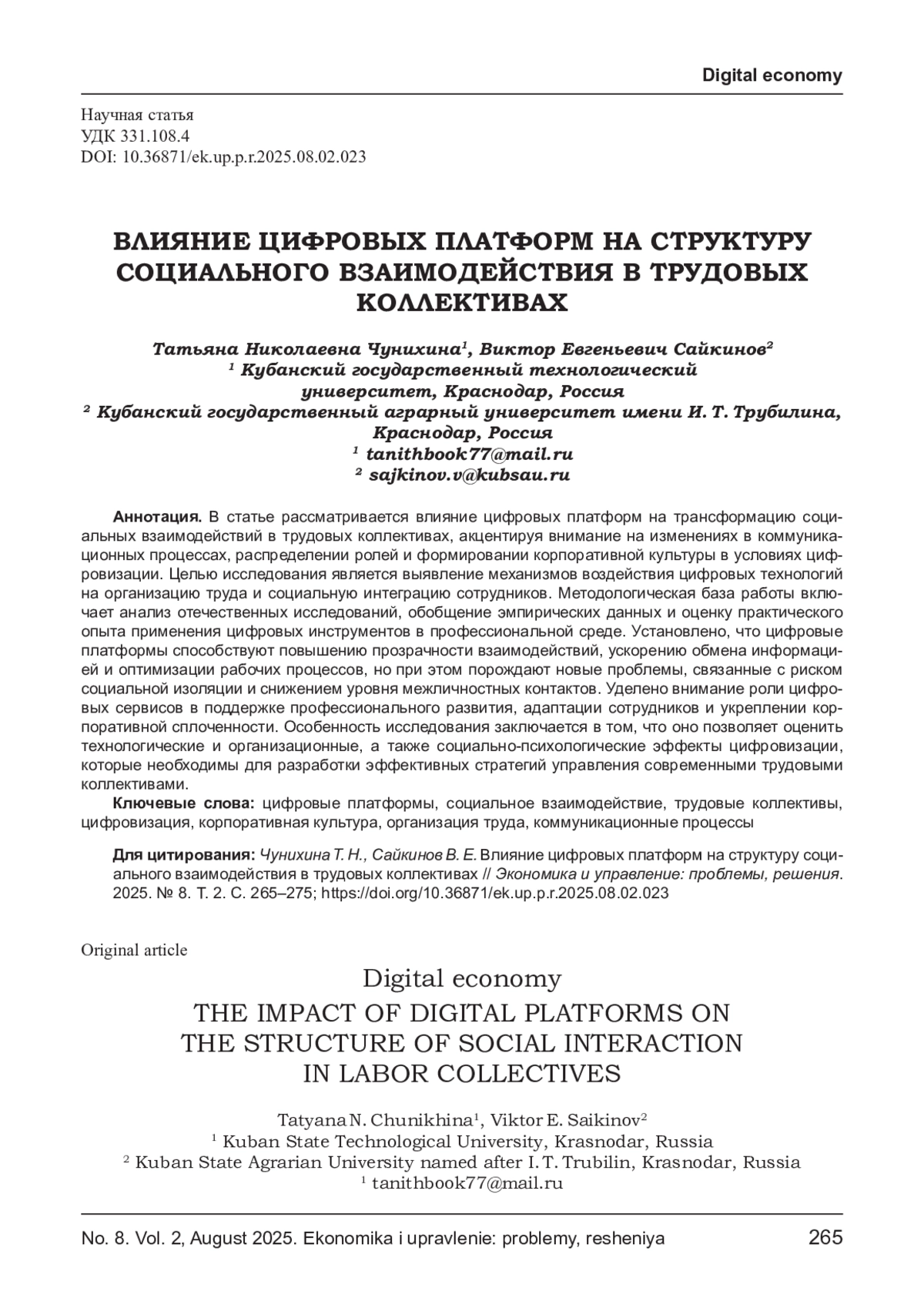 В статье рассматривается влияние цифровых платформ на трансформацию социальных взаимодействий в трудовых коллективах, акцентируя внимание на изменениях в коммуникационных процессах, распределении ролей и формировании корпоративной культуры в условиях цифровизации.