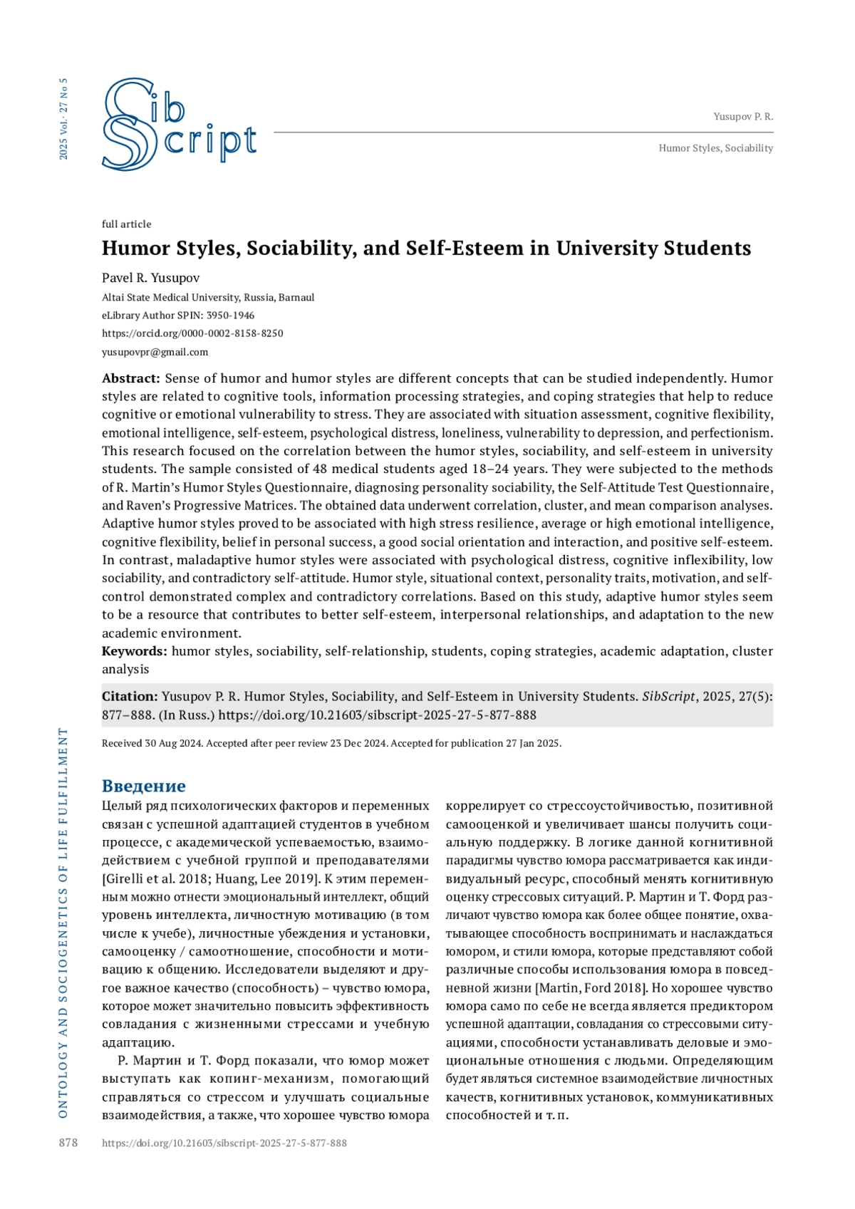Подчеркивается необходимость четкого разделения понятий чувства юмора и стилей юмора, которые могут представлять единую систему, но изучать эти феномены можно достаточно независимо. Цель – выявить взаимосвязи между используемыми стилями юмора, социабельностью как личностной устремленностью к социальному взаимодействию и аспектами самоотношения на студенческой выборке. Выборку составили 48 студентов медицинского вуза в возрасте 18–24 лет. Применены: опросник стилей юмора Р. Мартина; методика диагностики социабельности личности; тест-опросник самоотношения; прогрессивные матрицы Равена. Использованы методы корреляционного, кластерного анализа, анализ сравнения средних. Стили юмора сближаются с понятиями когнитивных инструментов, стратегий работы с информацией, копинг-стратегий, помогающих снижать когнитивную / эмоциональную уязвимость перед стрессами. Проанализированы исследования, изучающие взаимосвязь стилей юмора с целым рядом переменных: оценкой ситуации, когнитивной гибкостью, эмоциональным интеллектом, самооценкой, психологическим дистрессом, одиночеством, предрасположенностью к депрессии, перфекционизмом. Результаты исследования подтверждают, что использование адаптивных стилей юмора может быть связано с хорошей стрессовой устойчивостью, средним или высоким эмоциональным интеллектом, когнитивной гибкостью, верой в персональный успех, направленностью на общение и взаимодействие с другими, позитивным самоотношением и т. д. Неадаптивные стили юмора в целом чаще обнаруживают связь с психологическим дистрессом, когнитивной негибкостью, невысокой социабельностью, противоречивым самоотношением. Однако, результаты (как и результаты некоторых других исследований) скорее заставляют задуматься о сложной и противоречивой природе связей между использованием стилей юмора, ситуационным контекстом, личностными особенностями, мотивацией, способностью самоконтроля и т. д. Определена важность развития адаптивных стилей юмора как ресурса для повышения самооценки, улучшения межличностных отношений и адаптации студентов в учебной среде.