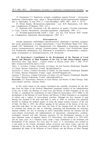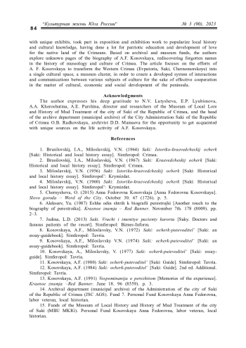 Статья: ВКЛАД А. Ф. КОСОВСКОЙ В РАЗВИТИЕ МУЗЕЯ КРАЕВЕДЕНИЯ И ИСТОРИИ ГРЯЗЕЛЕЧЕНИЯ ГОРОДА САКИ (СОЦИОКУЛЬТУРНЫЙ АСПЕКТ) (2023)