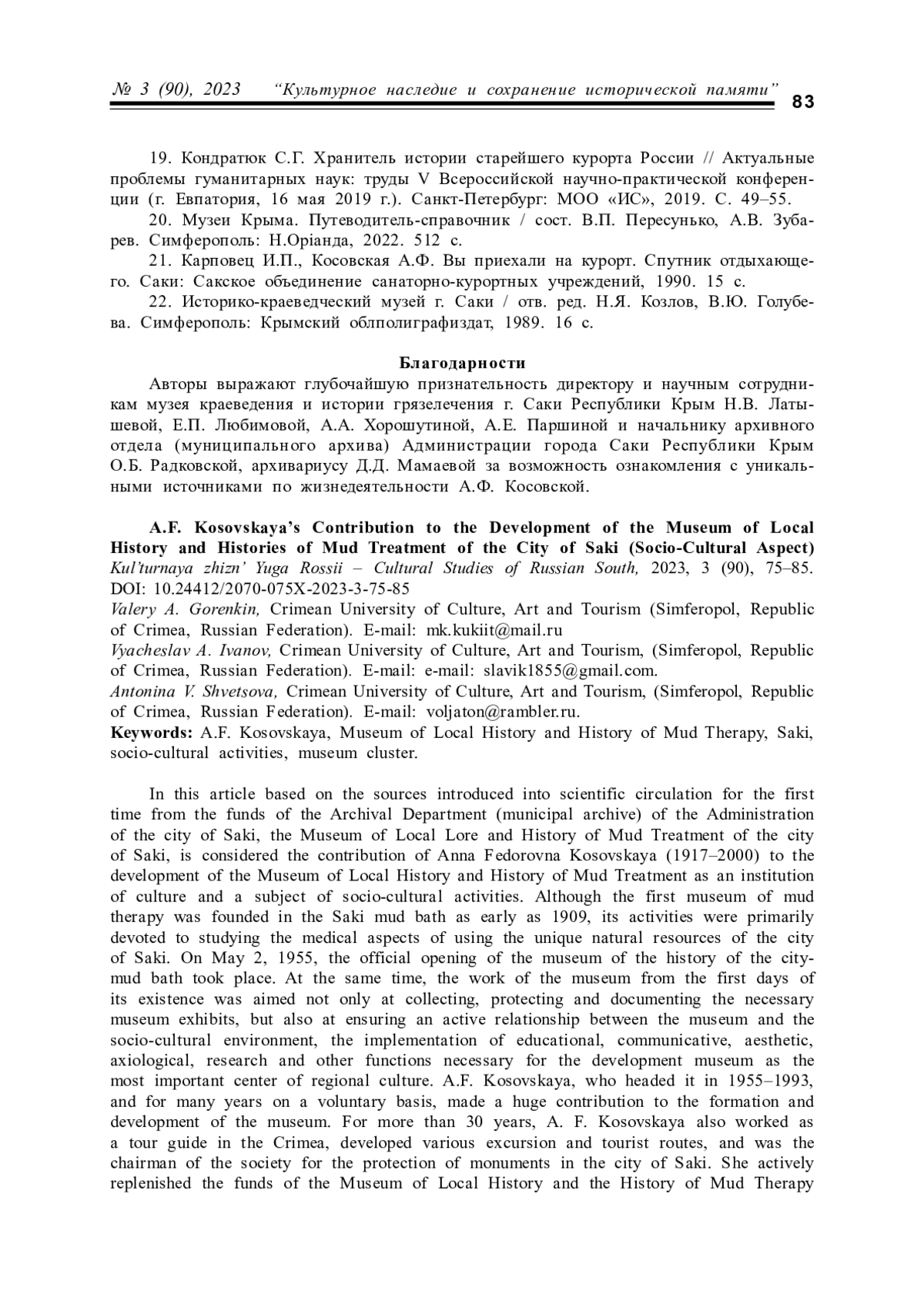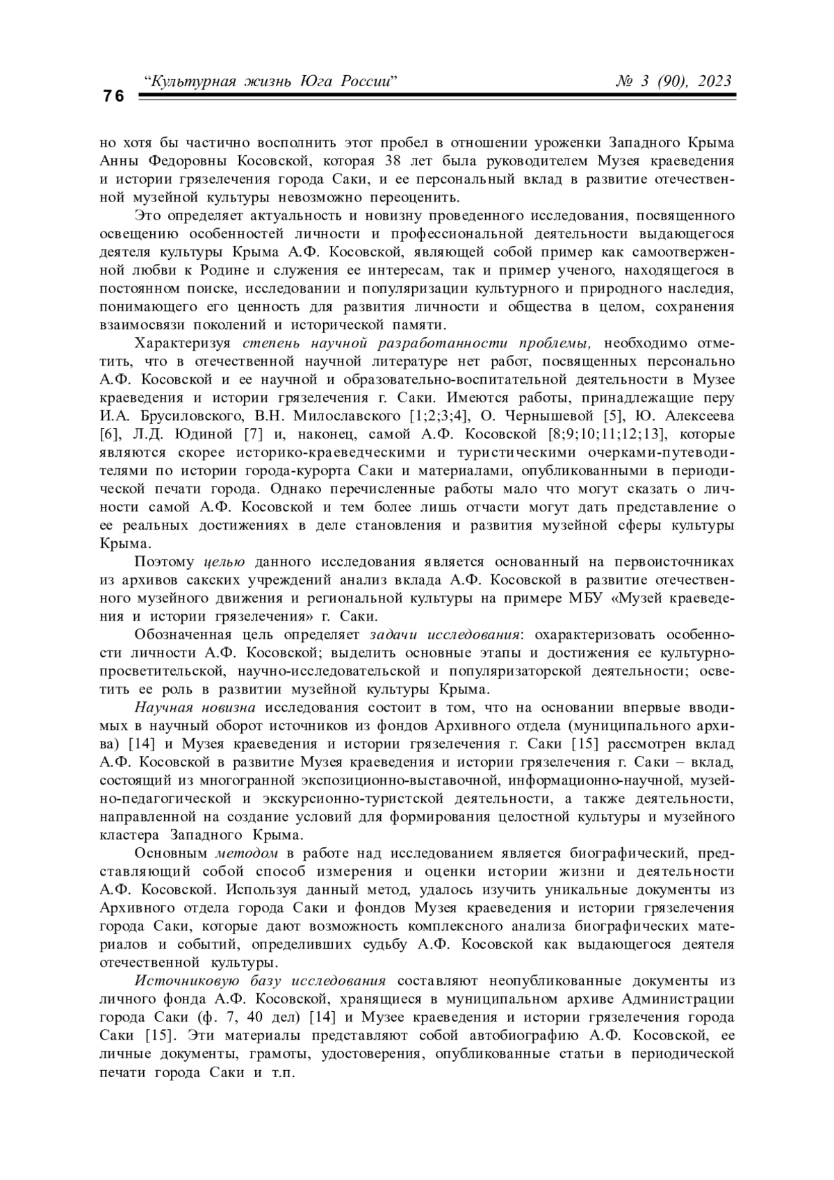 ГОРЕНКИН В. А., ИВАНОВ В. А., ШВЕЦОВА А. В. ВКЛАД А. Ф. КОСОВСКОЙ В РАЗВИТИЕ МУЗЕЯ КРАЕВЕДЕНИЯ И ИСТОРИИ ГРЯЗЕЛЕЧЕНИЯ ГОРОДА САКИ (СОЦИОКУЛЬТУРНЫЙ АСПЕКТ) // КУЛЬТУРНАЯ ЖИЗНЬ ЮГА РОССИИ. 2023. № 3 (90)