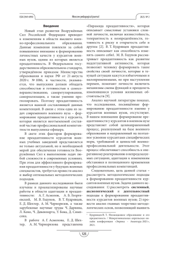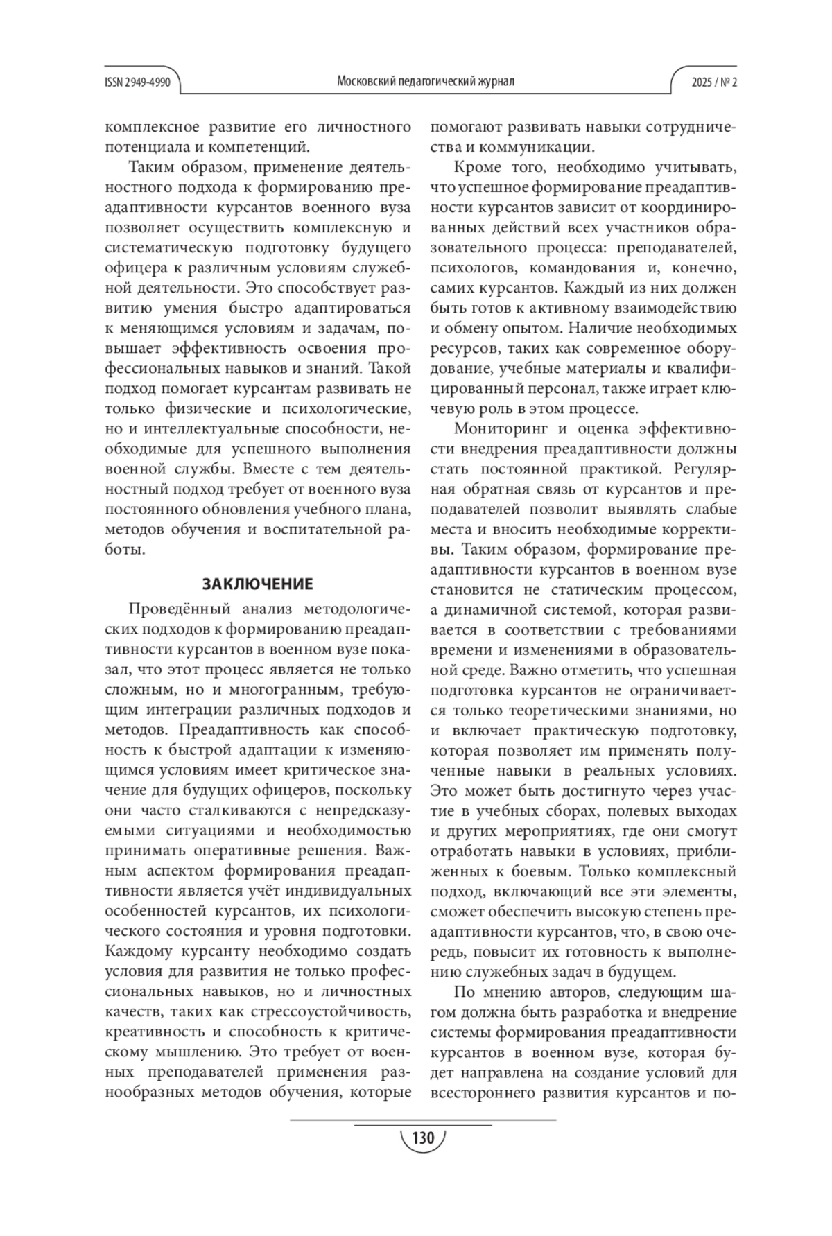 Статья: МЕТОДОЛОГИЧЕСКИЕ ПОДХОДЫ К ФОРМИРОВАНИЮ ПРЕАДАПТИВНОСТИ КУРСАНТОВ ВОЕННЫХ ВУЗОВ (2025)