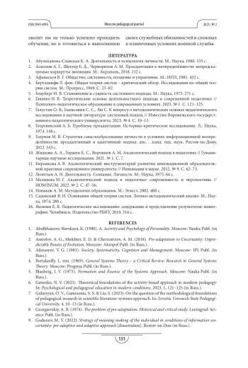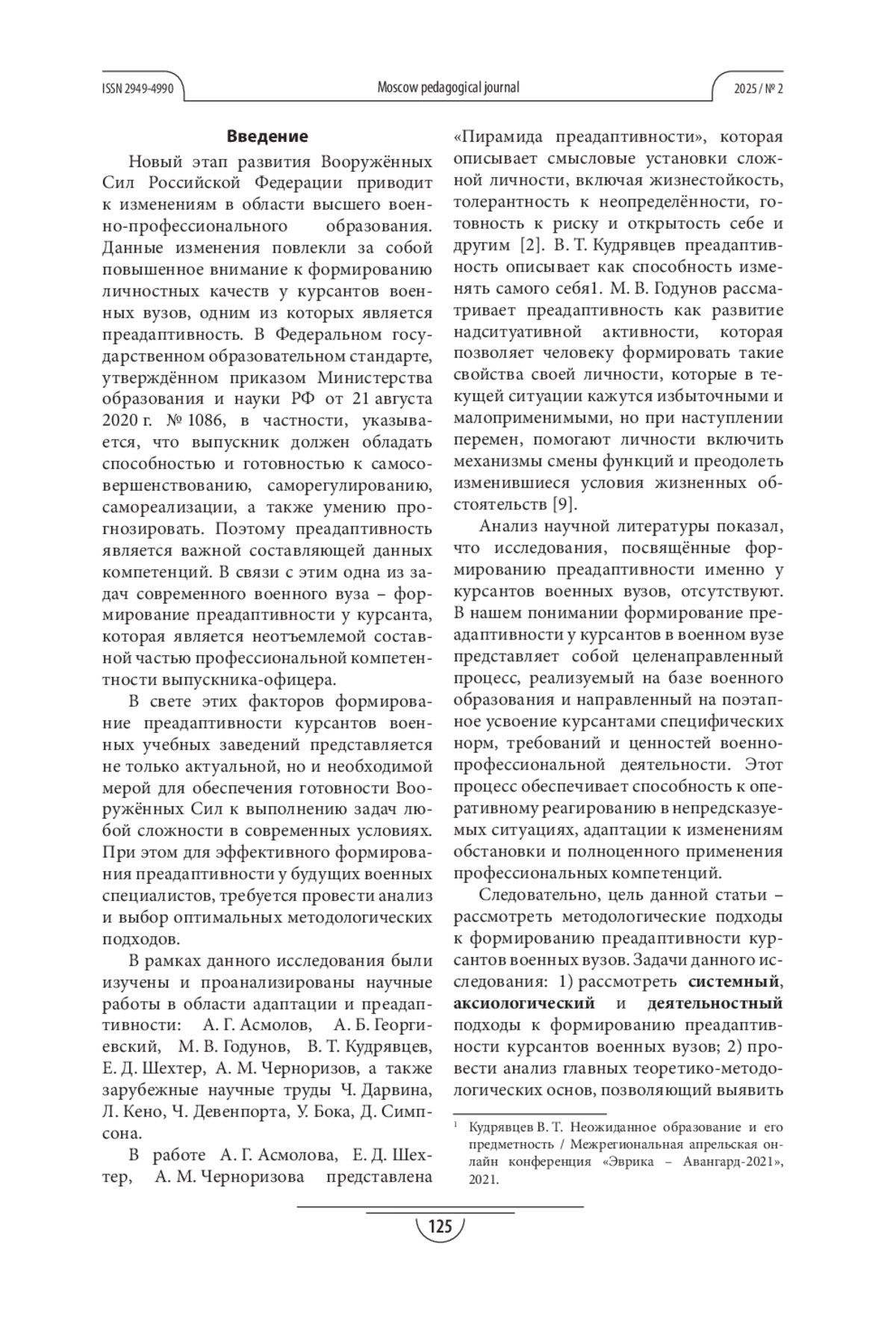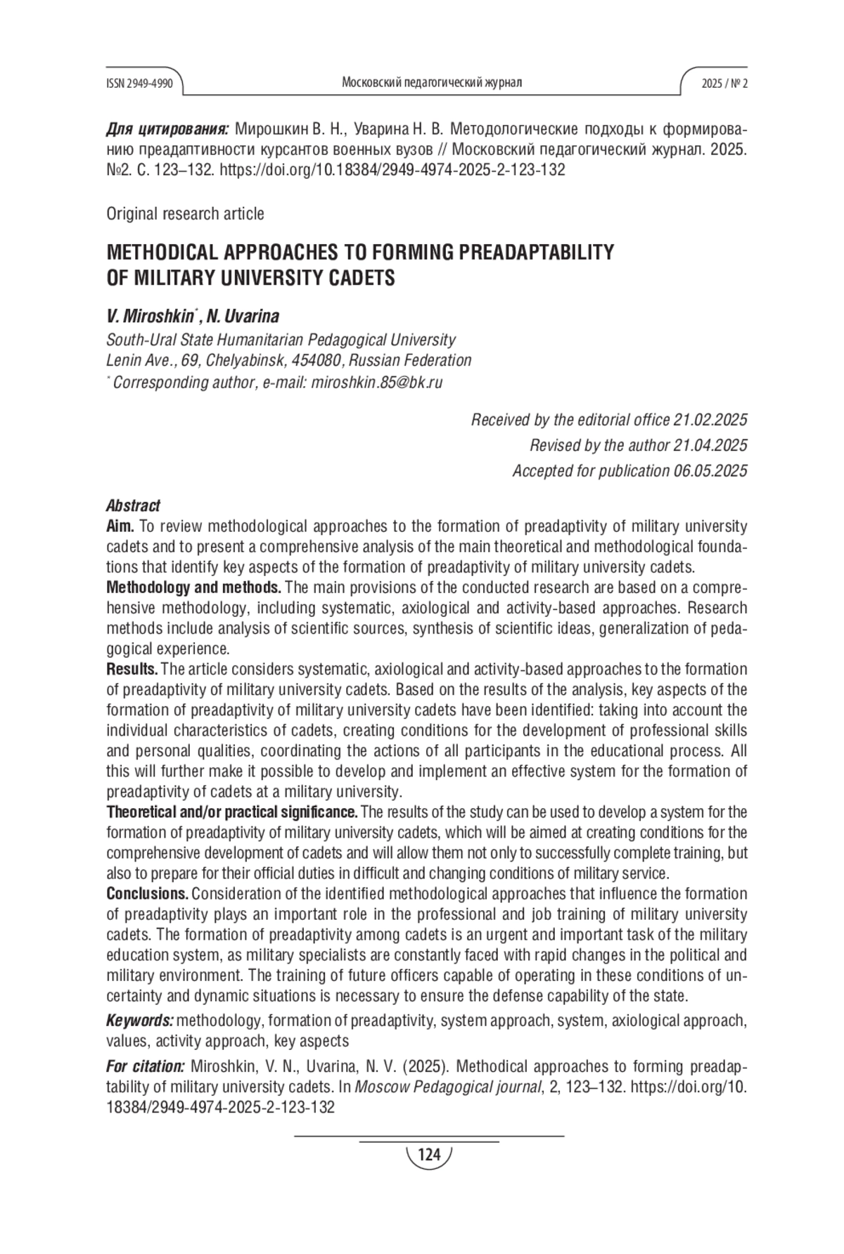 МИРОШКИН В. Н., УВАРИНА Н. В. МЕТОДОЛОГИЧЕСКИЕ ПОДХОДЫ К ФОРМИРОВАНИЮ ПРЕАДАПТИВНОСТИ КУРСАНТОВ ВОЕННЫХ ВУЗОВ // МОСКОВСКИЙ ПЕДАГОГИЧЕСКИЙ ЖУРНАЛ. 2025. № 2