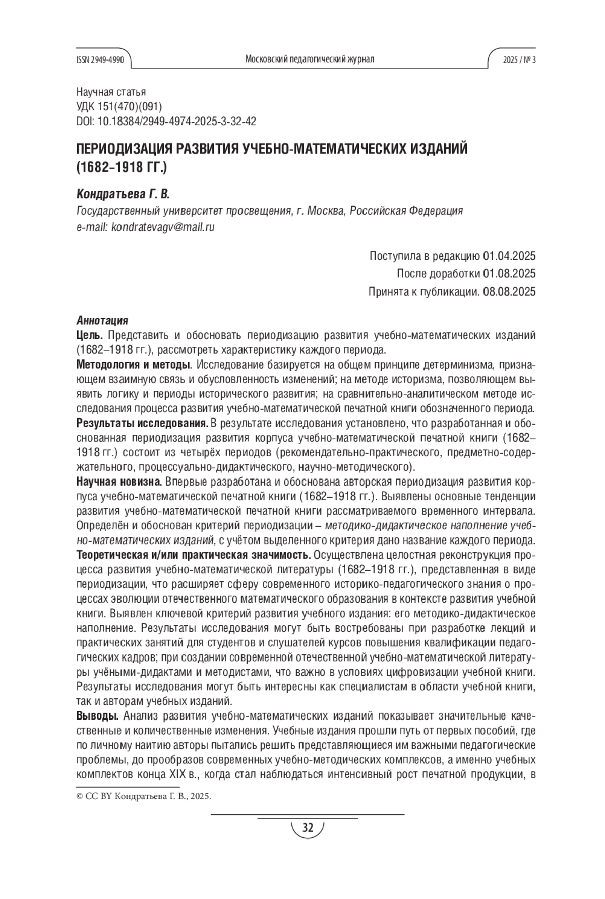 Теоретическая и/или практическая значимость. Осуществлена целостная реконструкция процесса развития учебно-математической литературы (1682-1918 гг.), представленная в виде периодизации, что расширяет сферу современного историко-педагогического знания о процессах эволюции отечественного математического образования в контексте развития учебной книги. Выявлен ключевой критерий развития учебного издания: его методико-дидактическое наполнение.