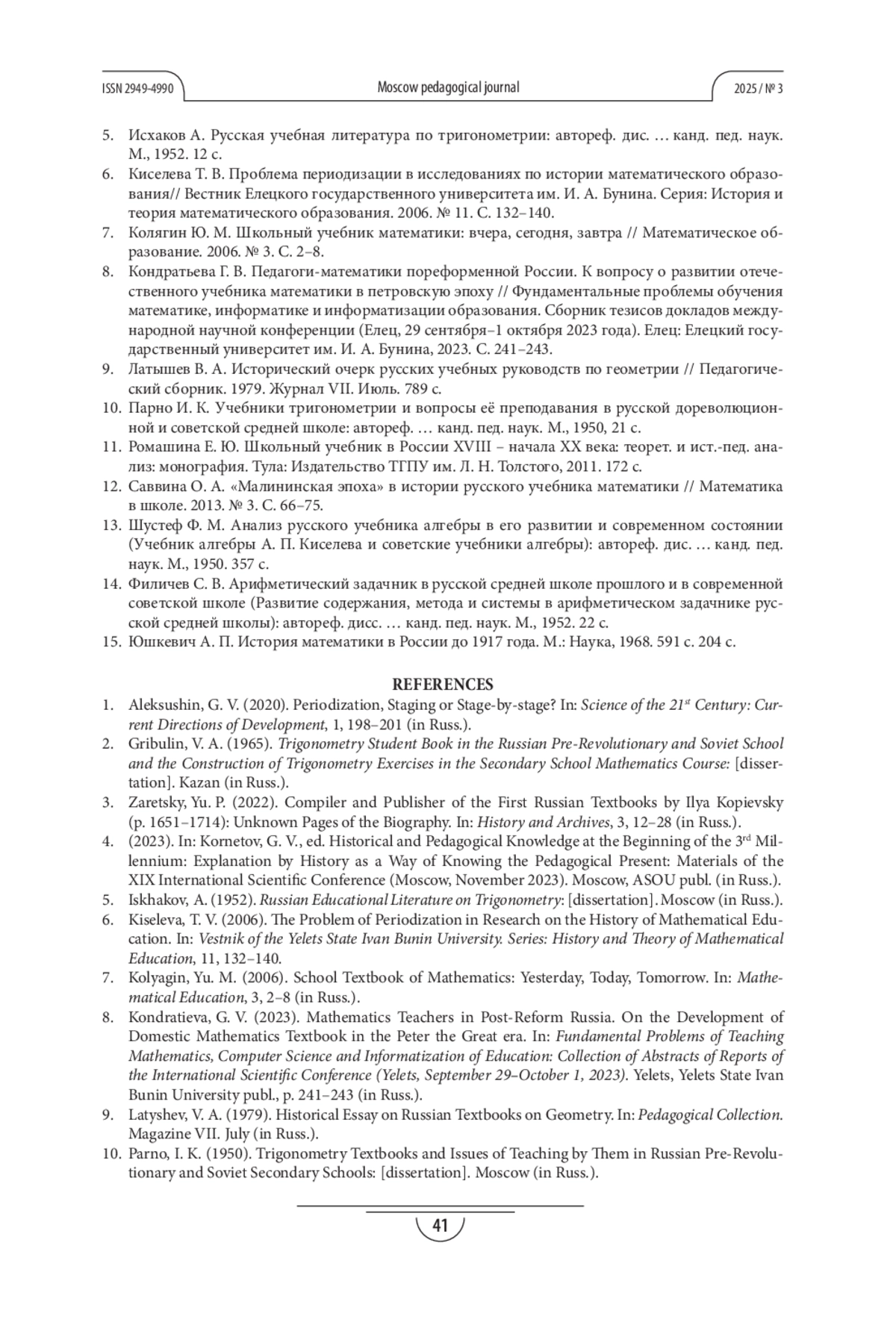 5. Исхаков А. Русская учебная литература по тригонометрии: автореф. дис. … канд. пед. наук. М., 1952. 12 с.