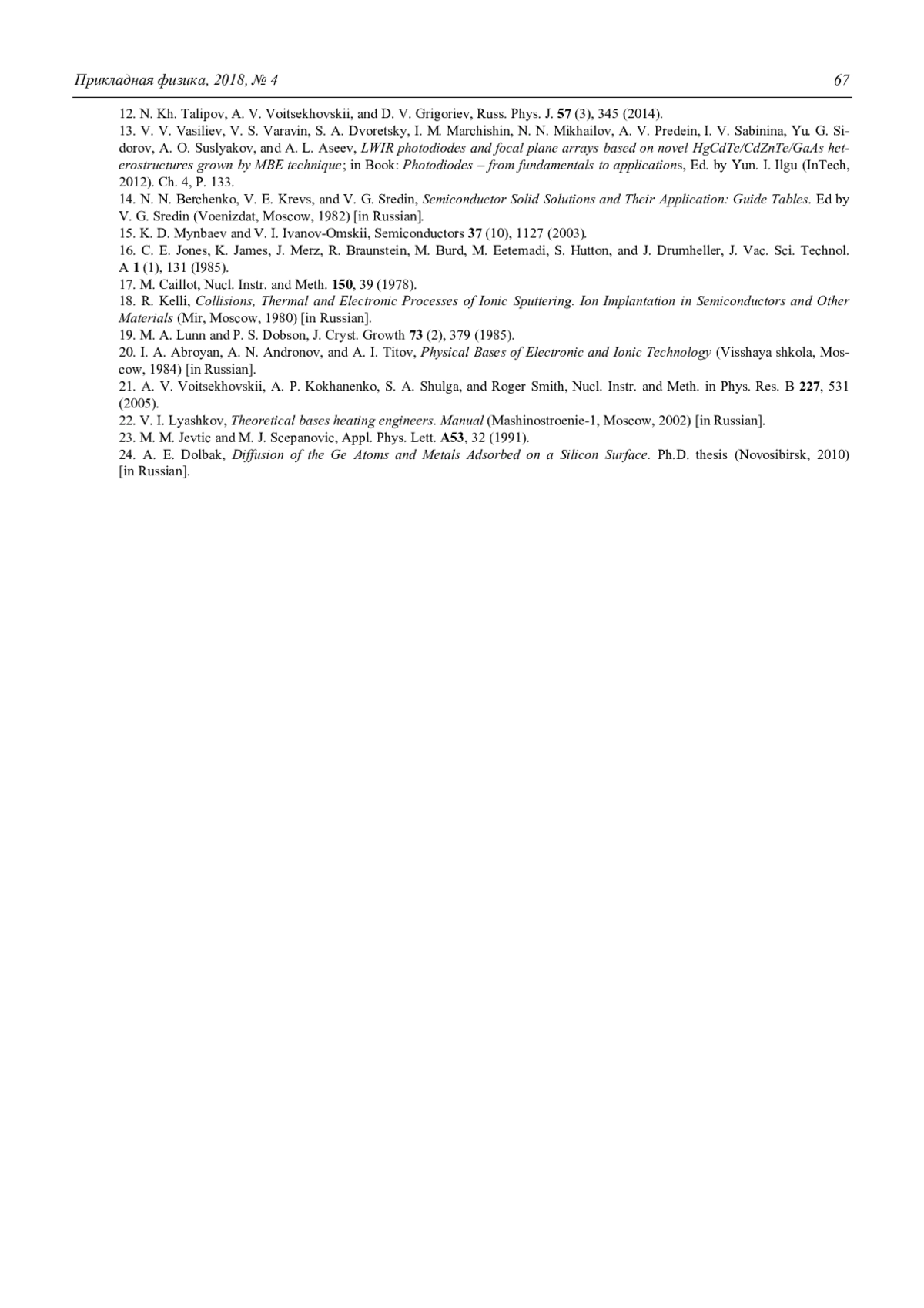 11. Fitsych O. I., Voitsekhovskii A.V., Grigorjev D. V., Mikhailov N. N., Talipov N. H., Mynbaev K. D., Izhnin I. I. // Nucl. Instr. and Meth. in Phys. Res. B. 2012. Vol. 272. P. 313.